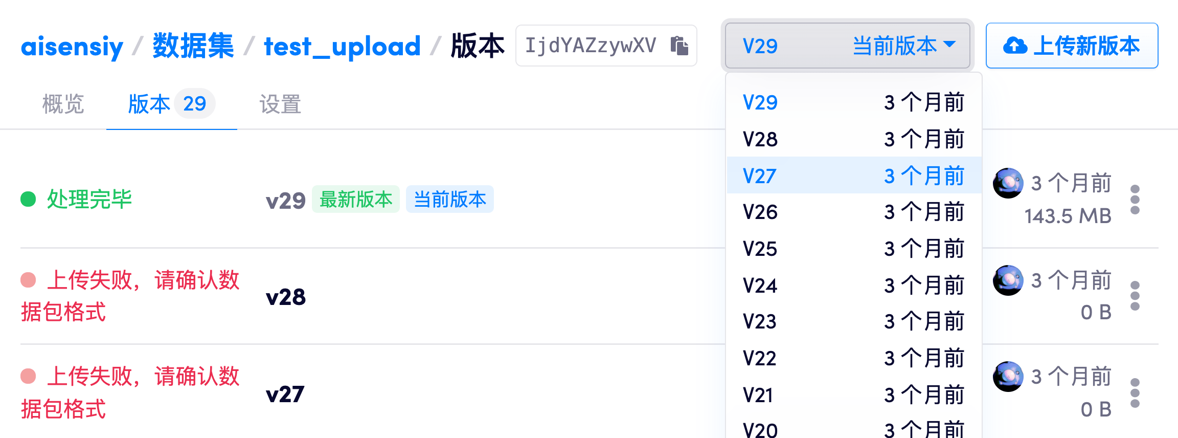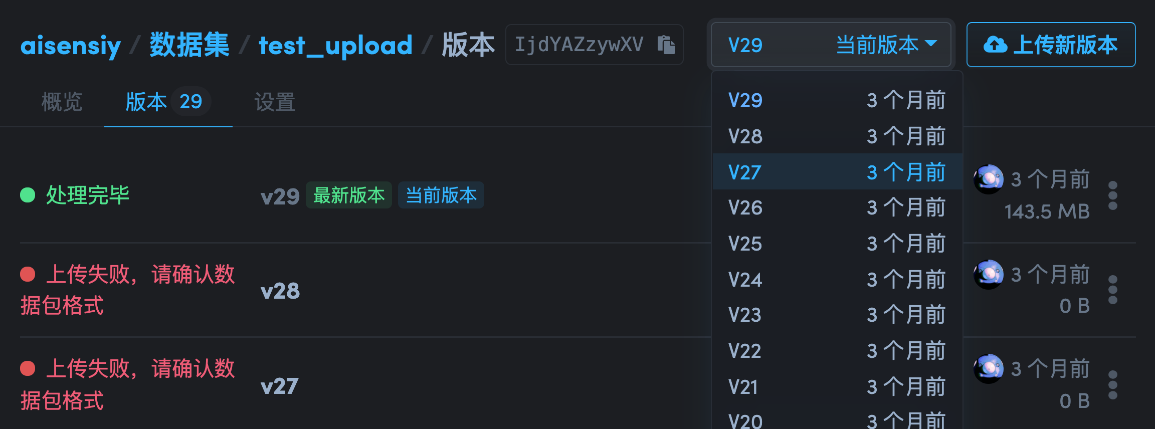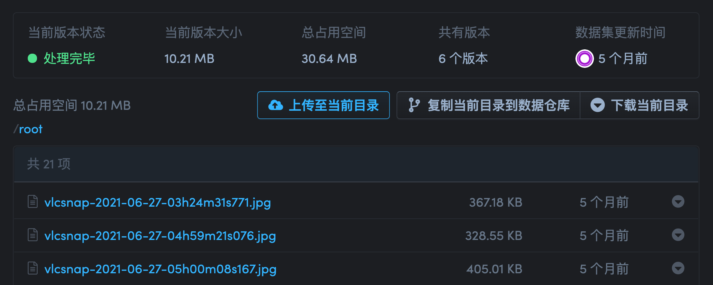 OpenBayes 平台内置数据版本控制,支持随时查看、删除老版本的数据。同时算力容器支持 绑定任意版本 的模型及数据集。方便数据对比