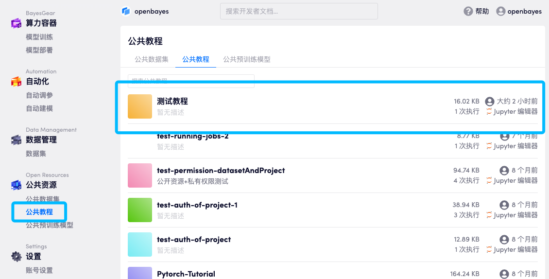 和「公开教程」的逻辑类似,将 openbayes 账号下的数据集设置为公开类型后就会在「公共资源」对应的类型中展示出来。