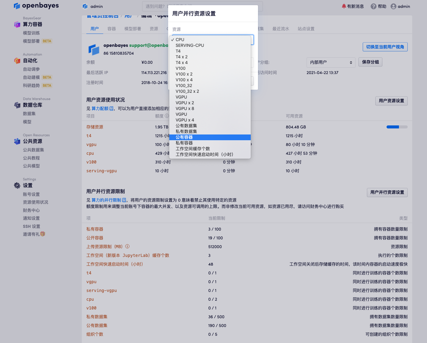 用户创建公共资源的个数也有上限,管理员可以在如下的配置中对「公有容器」的个数做修改: