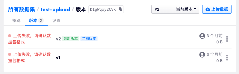 每次上传压缩包到后端服务后,数据集会将当前需要更新的数据集版本或者新创建的数据集版本标记为 PROCESSING 状态。上传的 zip 解压后会有两种状态:成功或者是失败。