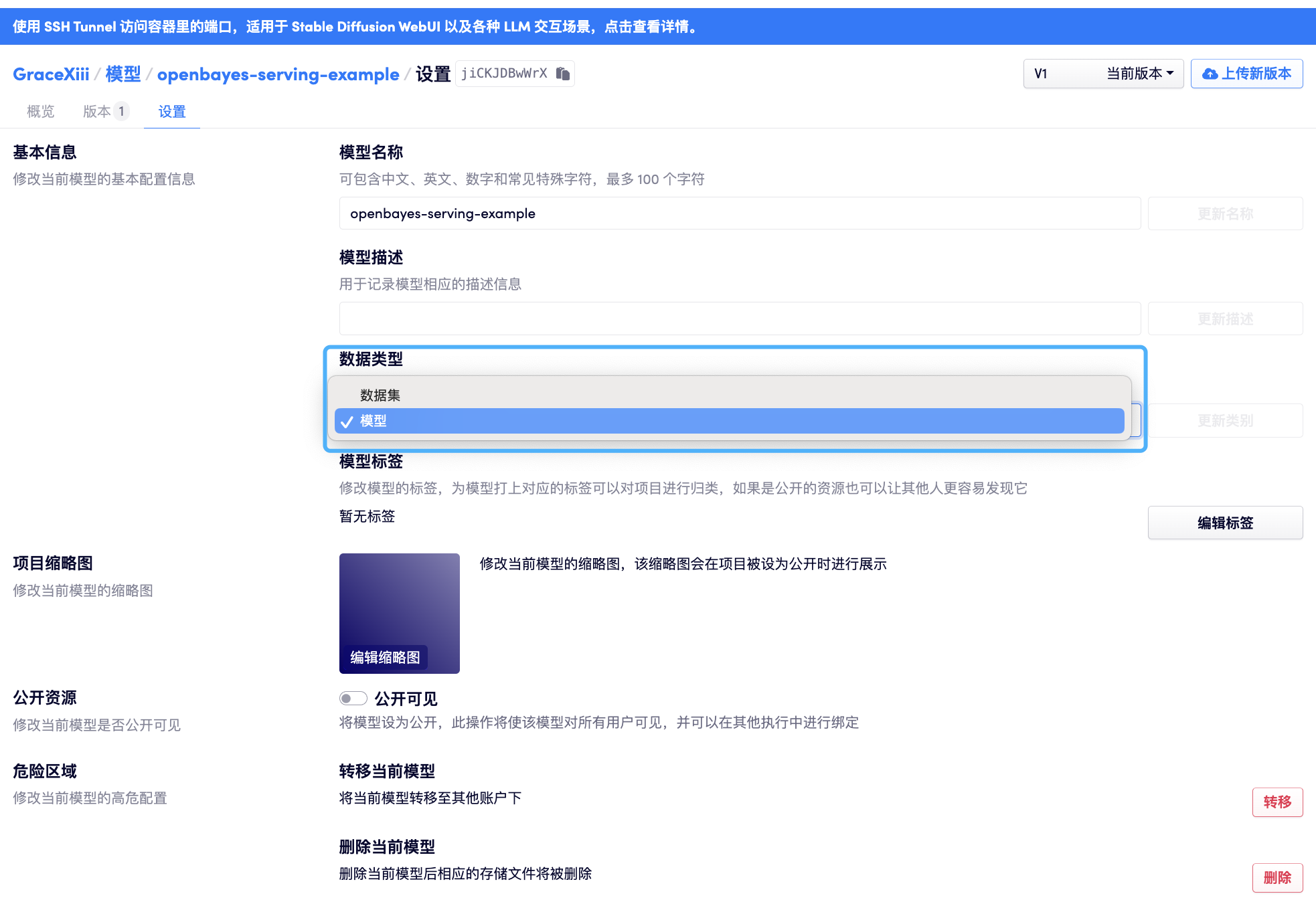 之前「数据仓库」被称作「数据集」,这更容易被理解为机器学习场景下的标注数据,而实际上这里除了放置标注数据外也可以放置其他任意类型的数据,包括代码、训练的模型文件等。为了避免这个歧义,也是为新的「模型部署」功能做准备,OpenBayes 对原有的「数据集」概念做了调整,将「数据集」改称作「数据仓库」