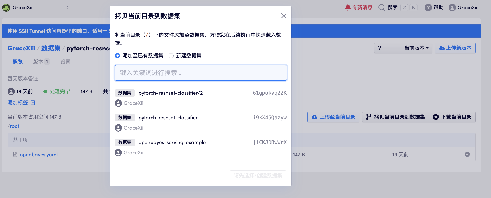 如上图所示,在一个数据仓库版本的某一个目录下点击「拷贝当前目录到数据集」即可选择指定的数据集,选择「添加至已有数据集」或「新建数据集」。