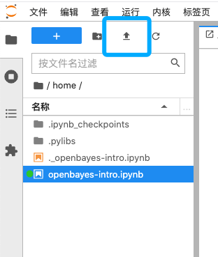 在启动「Jupyter 工作空间」后,在左侧的「文件浏览器」可以通过上次的「上传」实现单个文件的上传。