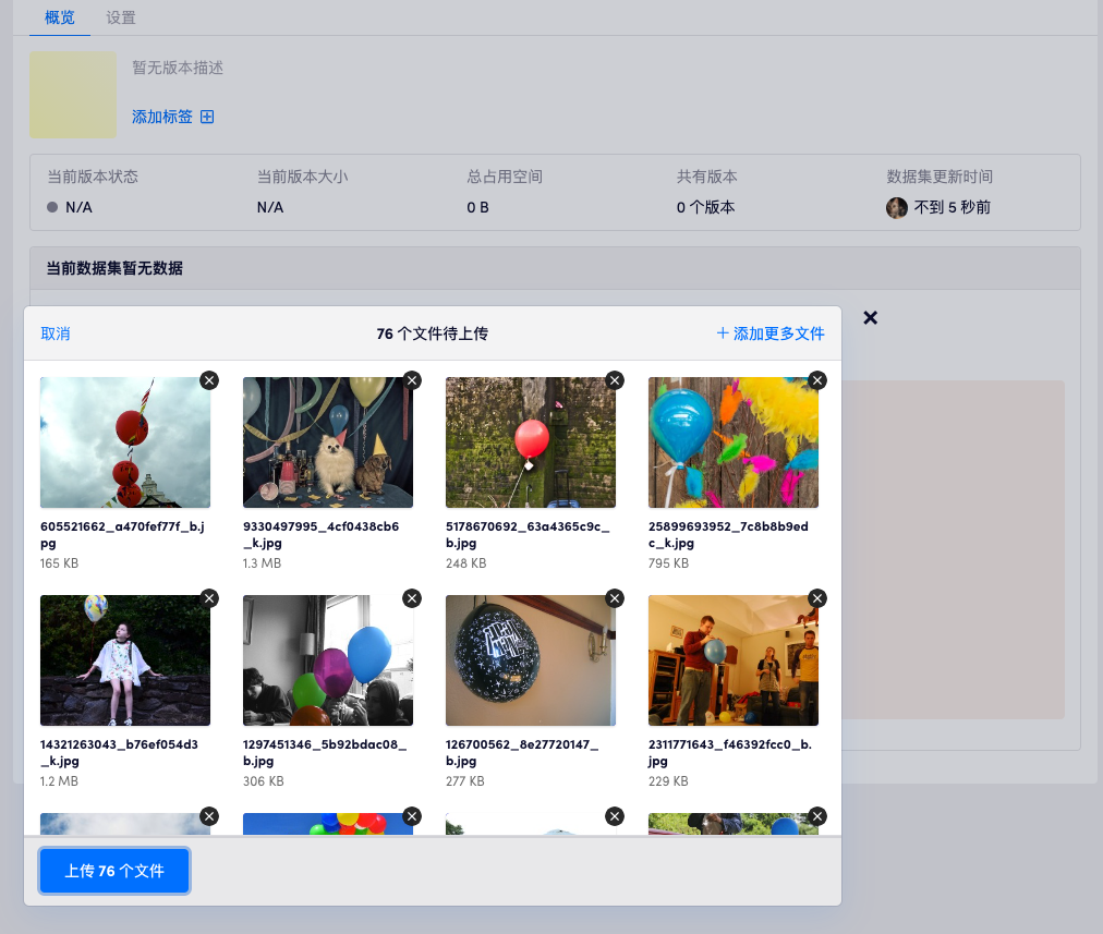 数据集上传支持「断点续传」,当因为网络或者意外导致一次上传中断后,如果上传的文件没有更改并且上传的目标数据集没有变化,数据会继续上一次的上传。