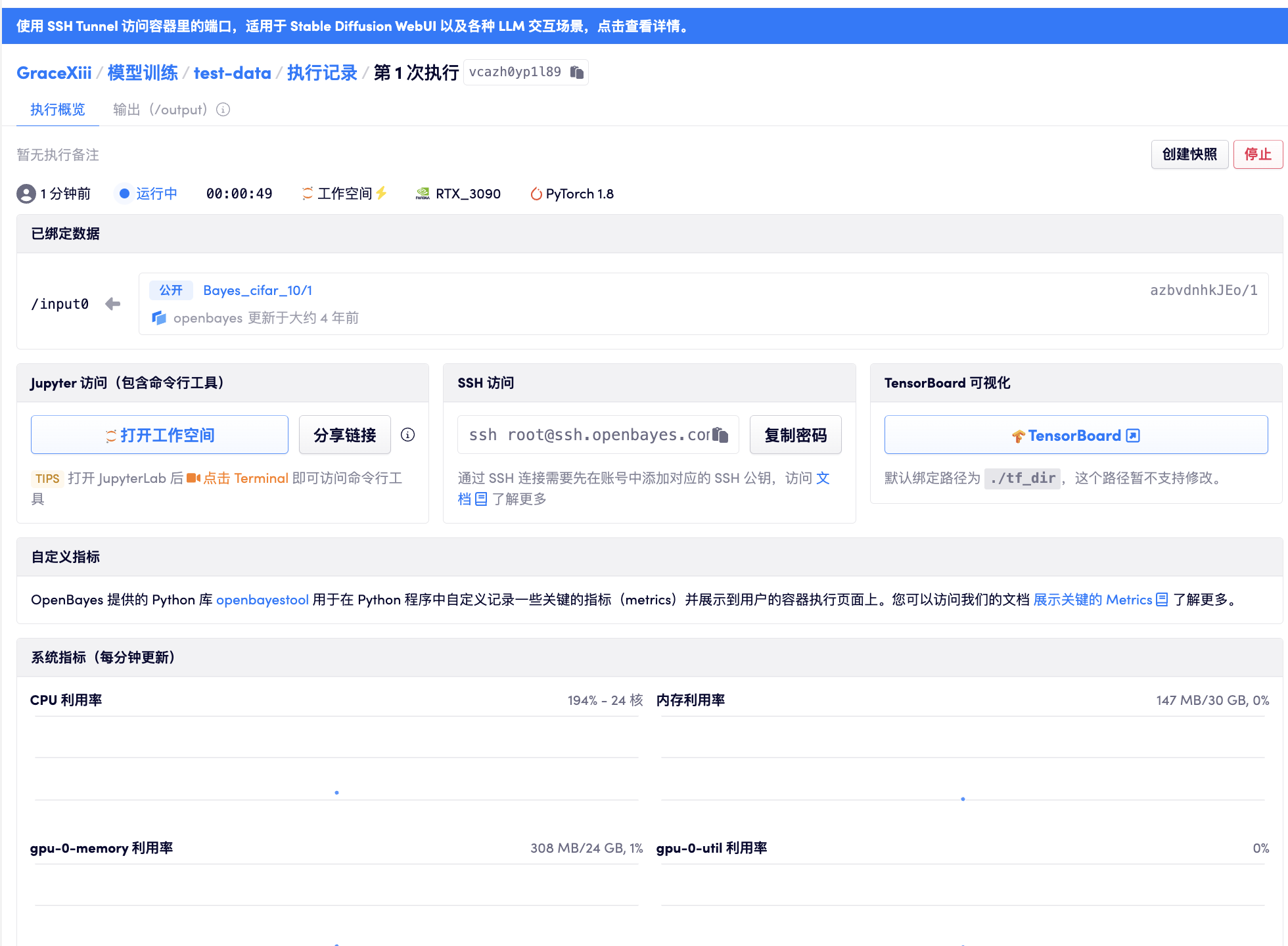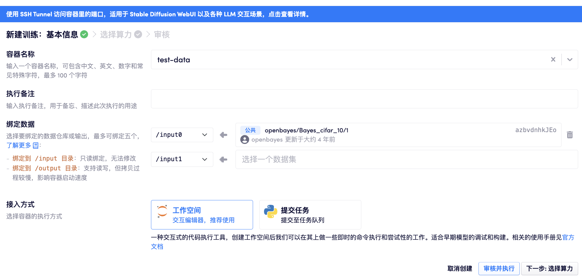 在绑定数据时,需要选定映射到容器中的目录,如下图所示,将 cifar_10 的数据绑定到了 /input0 意味着在容器中通过 /input0 目录就可访问数据集中的内容。