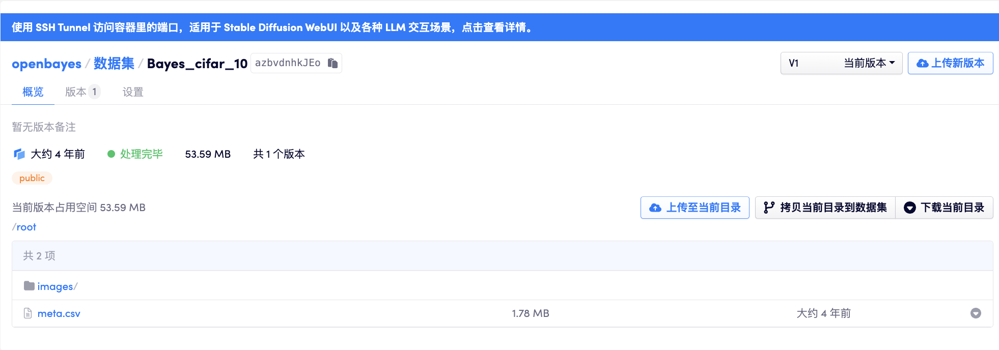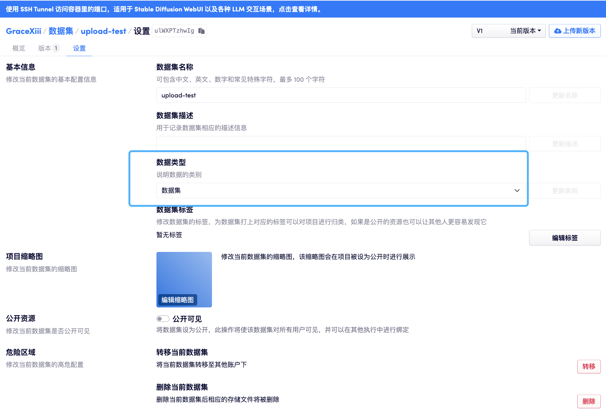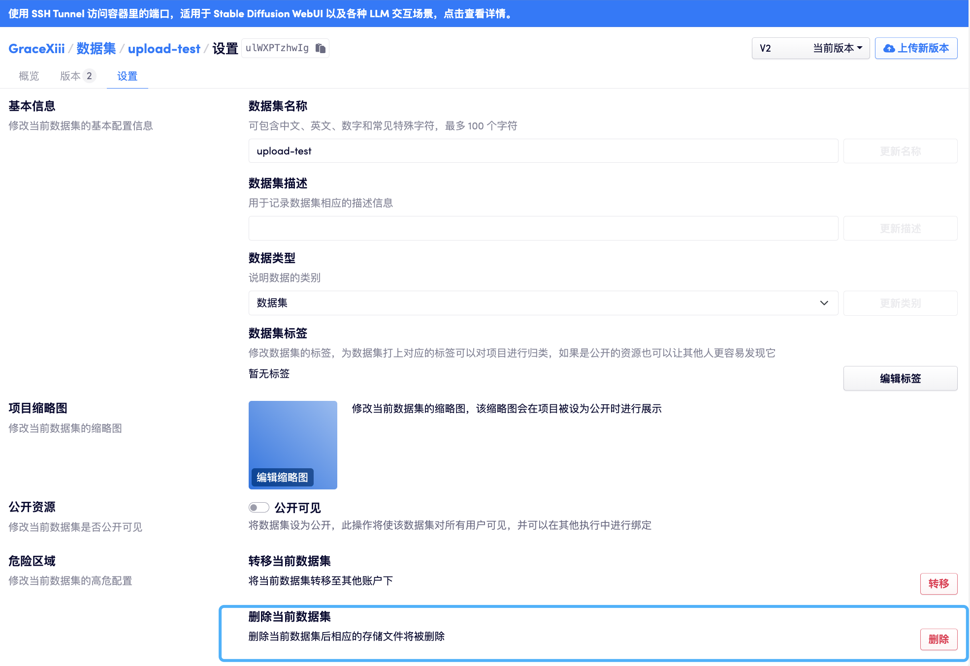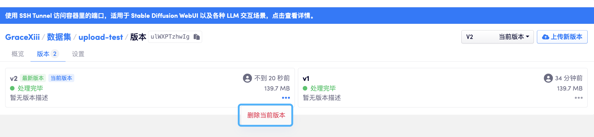 上文提到,数据集下可以包含多个版本,如果不再需要某一个特定的版本,可以在「版本」列表右侧的「删除当前版本」按钮处进行删除。该版本被删除后,其所占用的存储资源将会被释放。