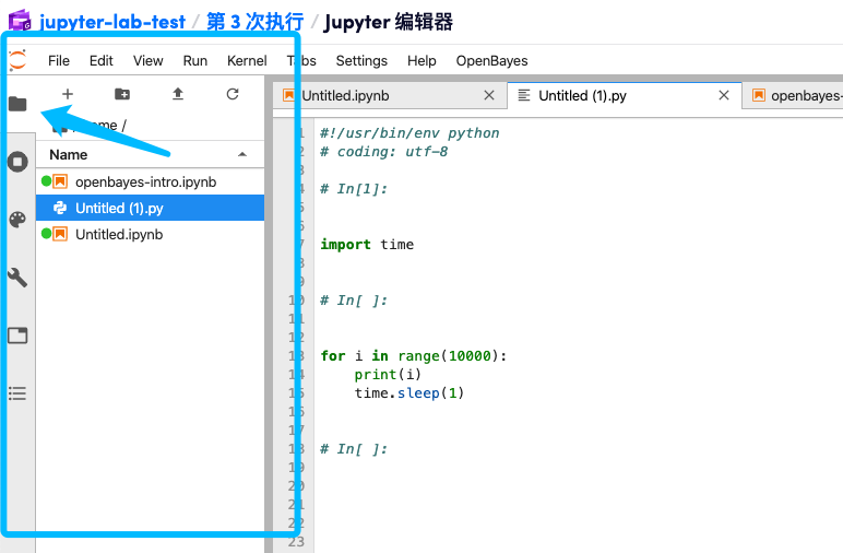 选择「File」-「Export Notebook As...」-「Export Notebook to Executable Script」就可以将当前的 ipynb 文件以 py 格式下载到本地。再将其拖动到 Jupyter 工作空间左侧的文件目录中即可将该文件再次上传到容器中:
