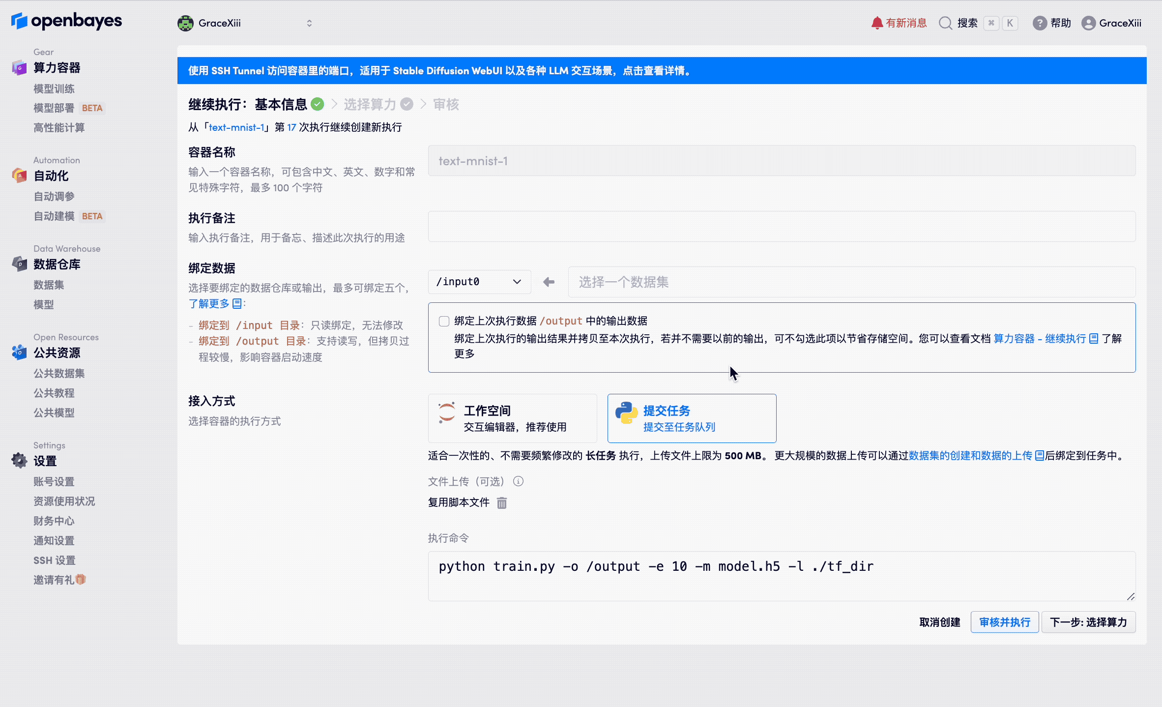 每次「执行」开始运行之后其运行时环境都会绑定其目录 /openbayes/home,作为容器的「工作目录」。该目录下的内容会在「执行」关闭后被保存下来,并可以通过页面中的「工作目录」选项卡查看。