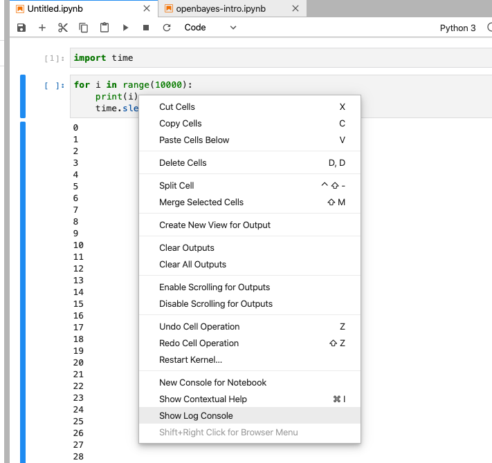 这个代码块会一直更新日志,但是如果我们刷新页面后再回来会发现日志不再更新了。这个时候在该代码块中右键点击「Show Log Console」打开当前的 Log Console 界面。
