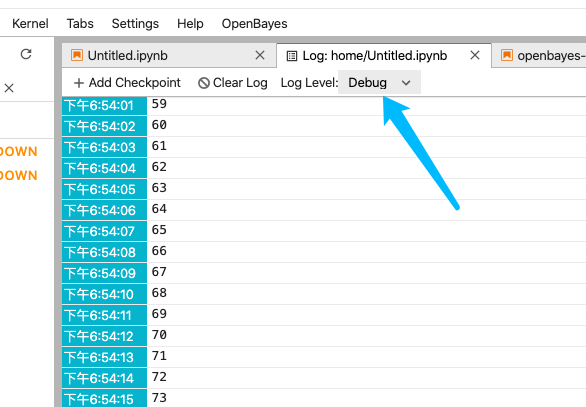 然后选择 Debug 级别的日志就可以看到之前的日志进度了: