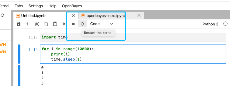 每次在 Jupyter 工作空间中打开一个 .ipynb 文件后系统会对应的创建一个名为 kernel 的后台负责执行在页面提交的代码。如果发现自己的 .ipynb 文件执行命令出现了问题,最简单的处理方法就是重启对应的 kernel: