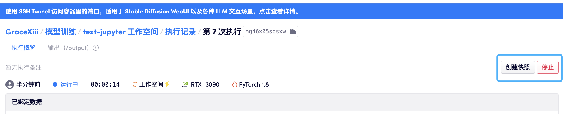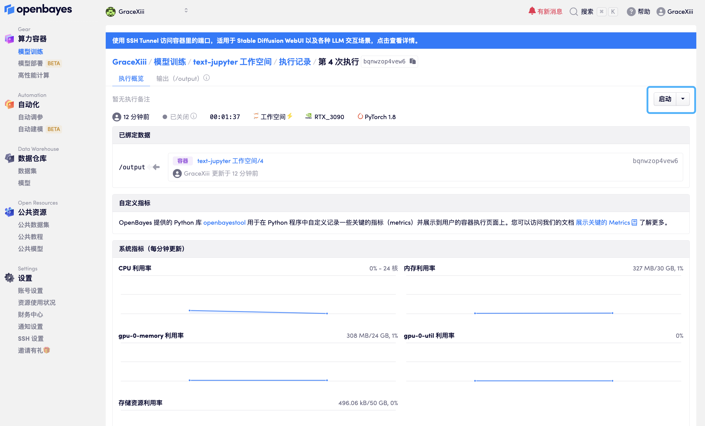 点击页面上的「启动」进行快速启动,默认保留上一次执行的「数据绑定」「算力」「运行时环境」(镜像),并自动绑定上一次运行时「工作目录」的数据。