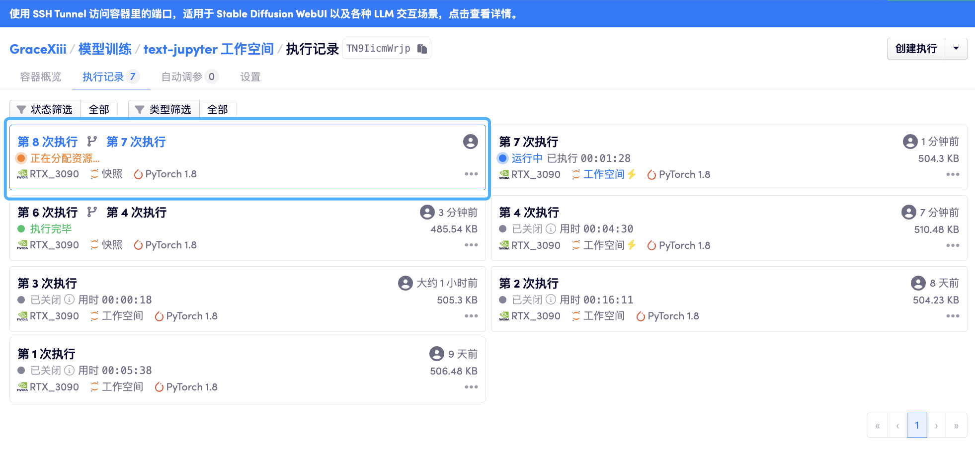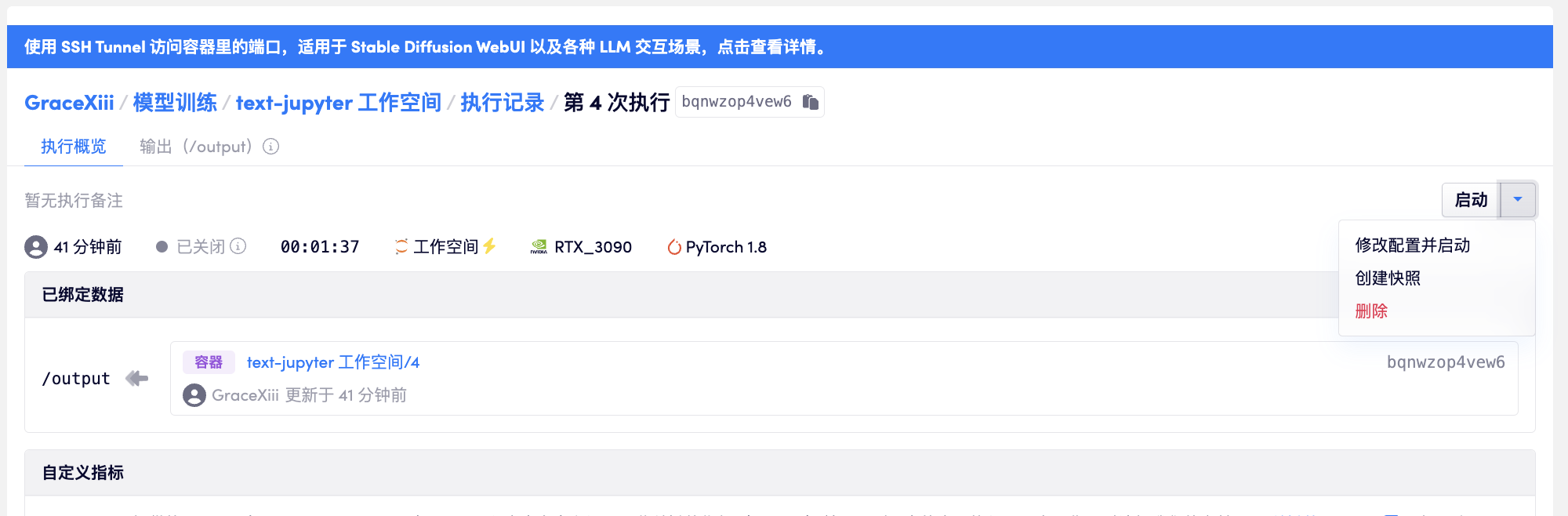 - 每次启动都会自动绑定之前的「工作目录」内容,同时允许对「算力」、「运行时环境」(镜像)、数据绑定(input 绑定)等配置做调整。
