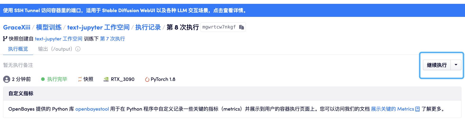 快照会记录工作空间所使用的「算力类型」「数据绑定」「镜像类别」,通过「继续执行」可以从这个快照启动新的「工作空间」,默认沿用快照所记录的以上配置并将快照的「工作目录」拷贝到新的工作空间的 /openbayes/home 目录下: