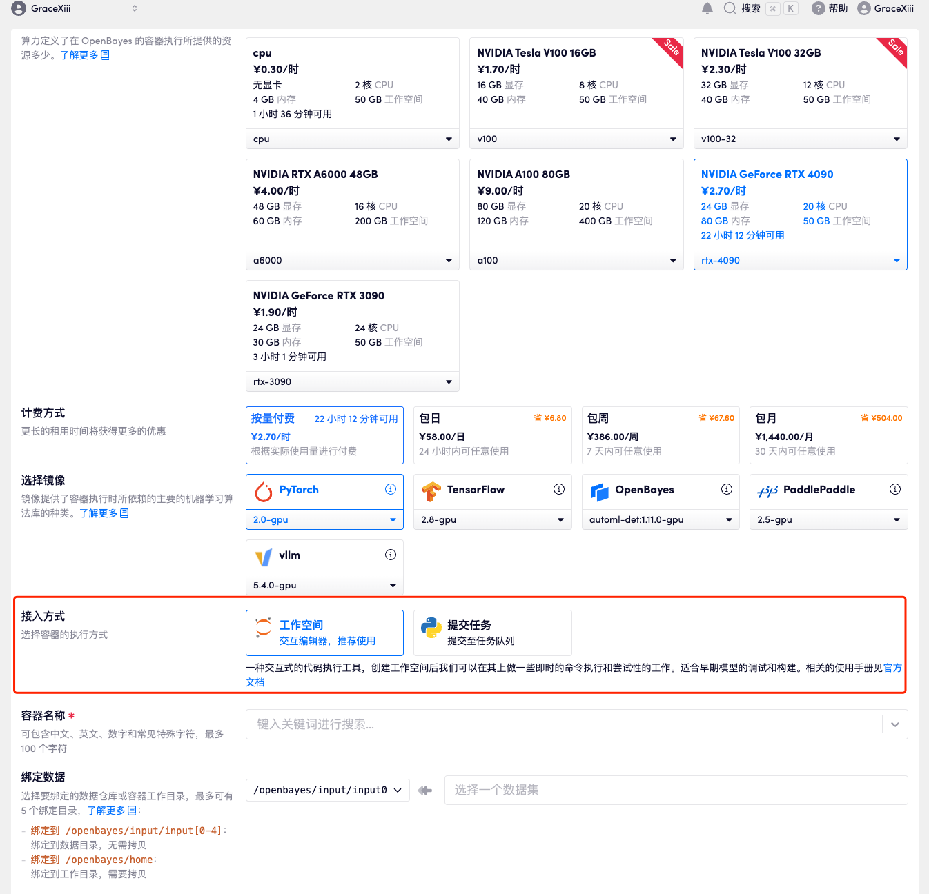 之后可以按照流程修改算力、运行时环境(镜像)、数据绑定等信息。