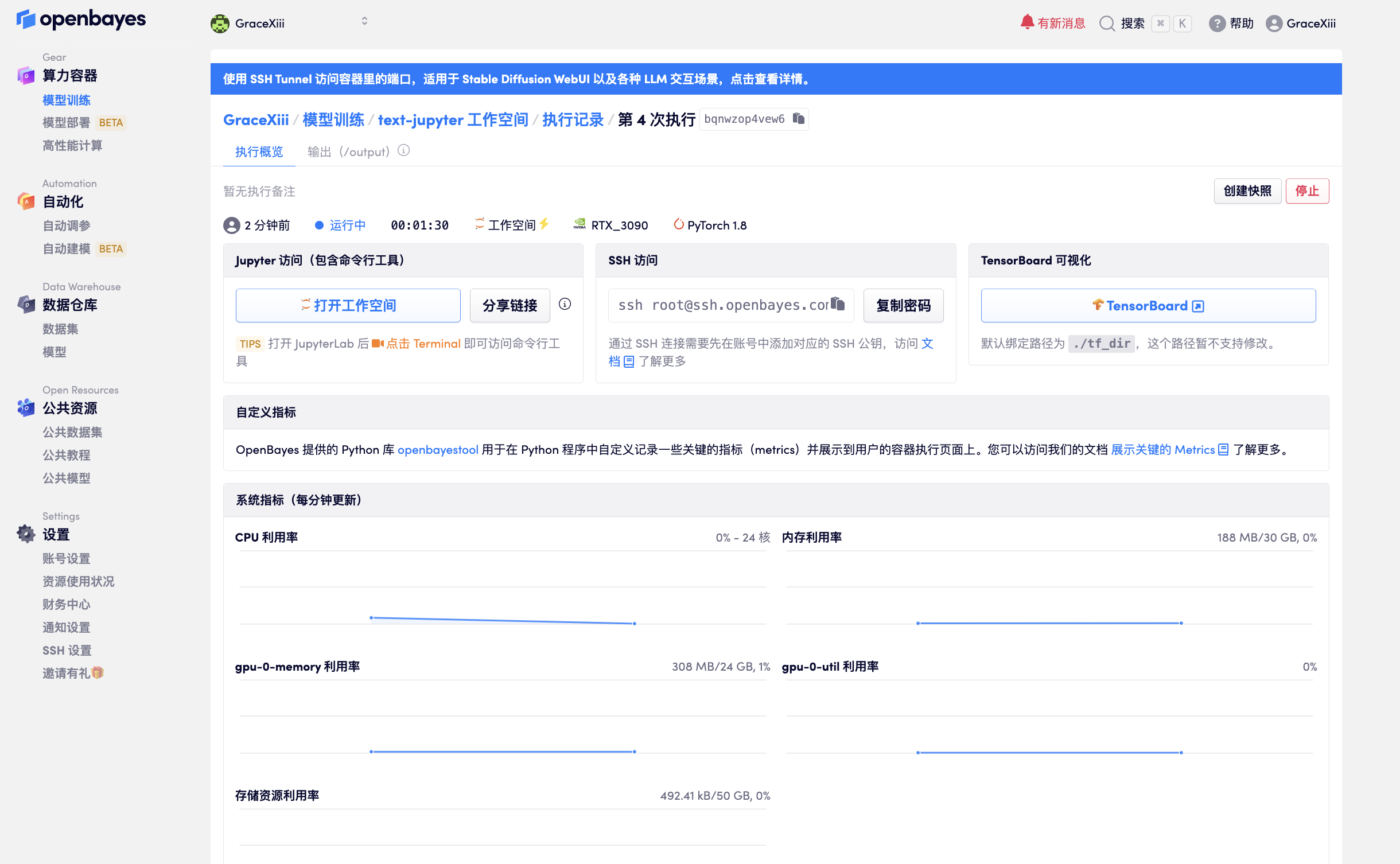「Jupyter 工作空间」(后面也会直接称为「工作空间」)是 OpenBayes 平台提供的交互式编程环境: