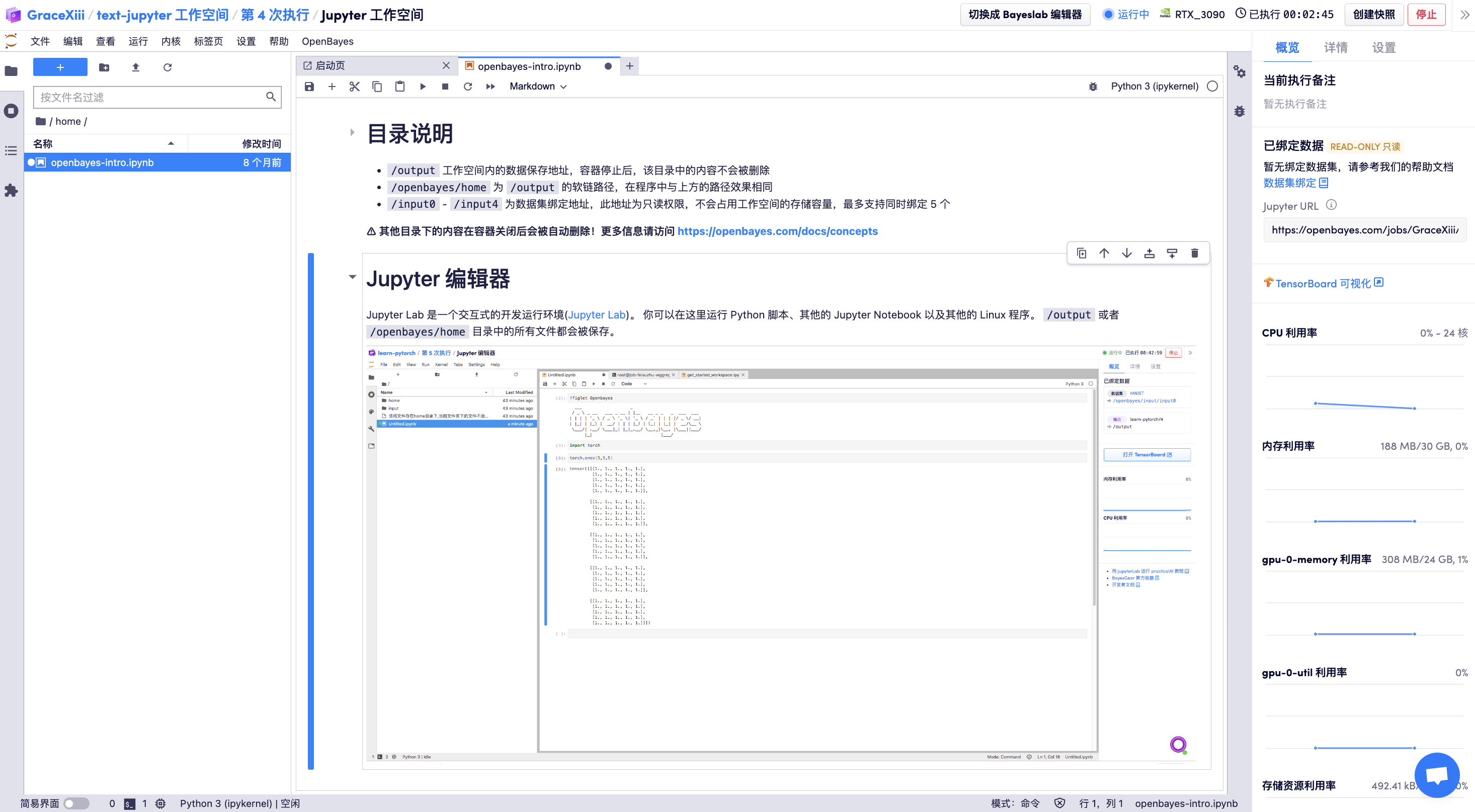 其中右侧的侧边栏展示了当前执行的一些基本信息,包括系统指标、执行的基本信息(算力类型、运行环境、运行时间)以及设置界面。其中通过系统指标可以了解到当前执行是否在有效的利用系统所提供的计算资源。在执行打开后也会默认弹出 openbayes-intro.ipynb 文件包含了 OpenBayes Jupyter 工作空间的一些基本介绍。