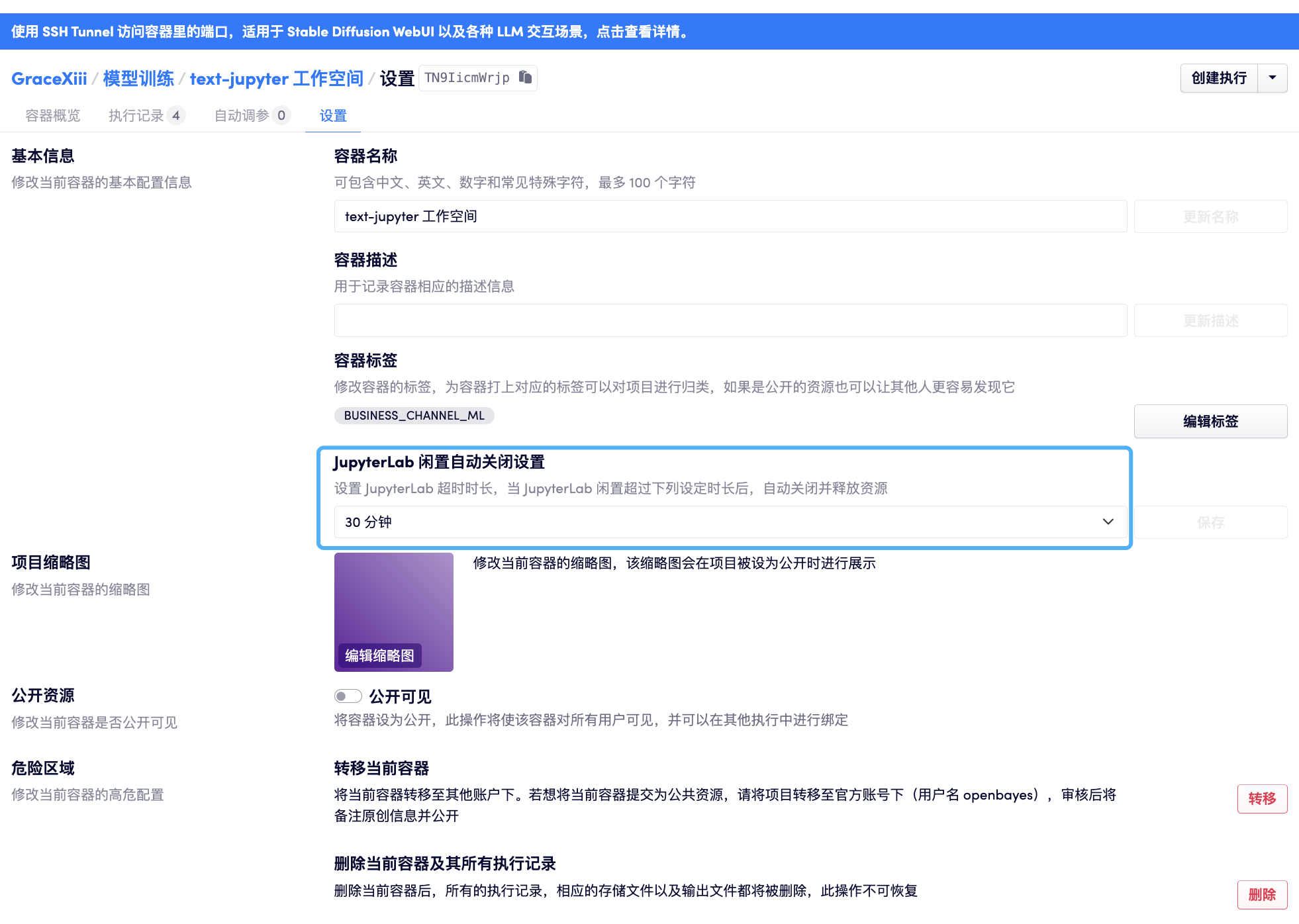 在「容器」的「设置」选项卡可以看到「JupyterLab 闲置自动关闭设置」,可以设置容器处于空闲状态多少长时间将被自动关闭,默认的时长为 30 分钟。当容器被认定为空闲状态后容器的创建者会收到提醒(通过短信或者邮箱发送),如果容器依然处于空闲状态,将会因为空闲时间达到设置的最大空闲时间而被关闭,在这种情况下 OpenBayes 也会为容器的创建者发送一个容器被关闭的通知。有关容器空闲关闭的通知方式可以在 gear#设定通知 进行配置。