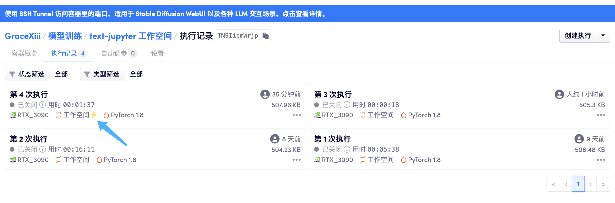 在单次执行的页面点击「打开 Jupyter 工作空间」进入如下的界面: