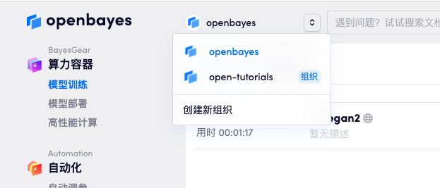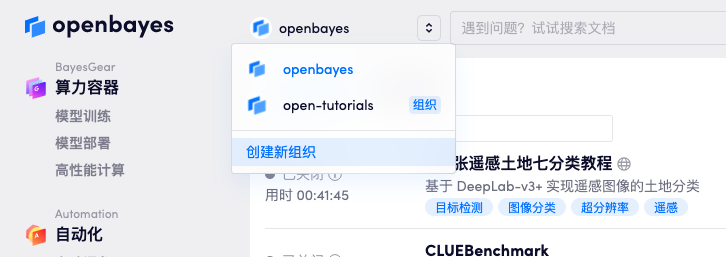 在登录 OpenBayes 后,点击导航条上的用户名可以看到一个下拉菜单,点击「创建新组织」。