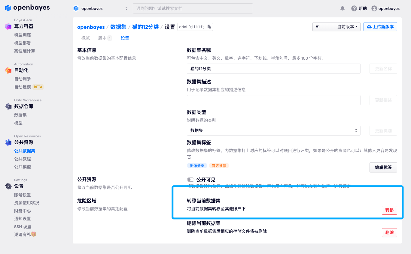 首先选择一个「私有空间」下的数据仓库,点击导航下的「设置」可以看到页面有「转移当前数据集」的选项: