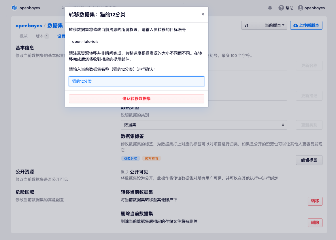 点击「转移」并按照提示输入组织名称并确认数据仓库的名称: