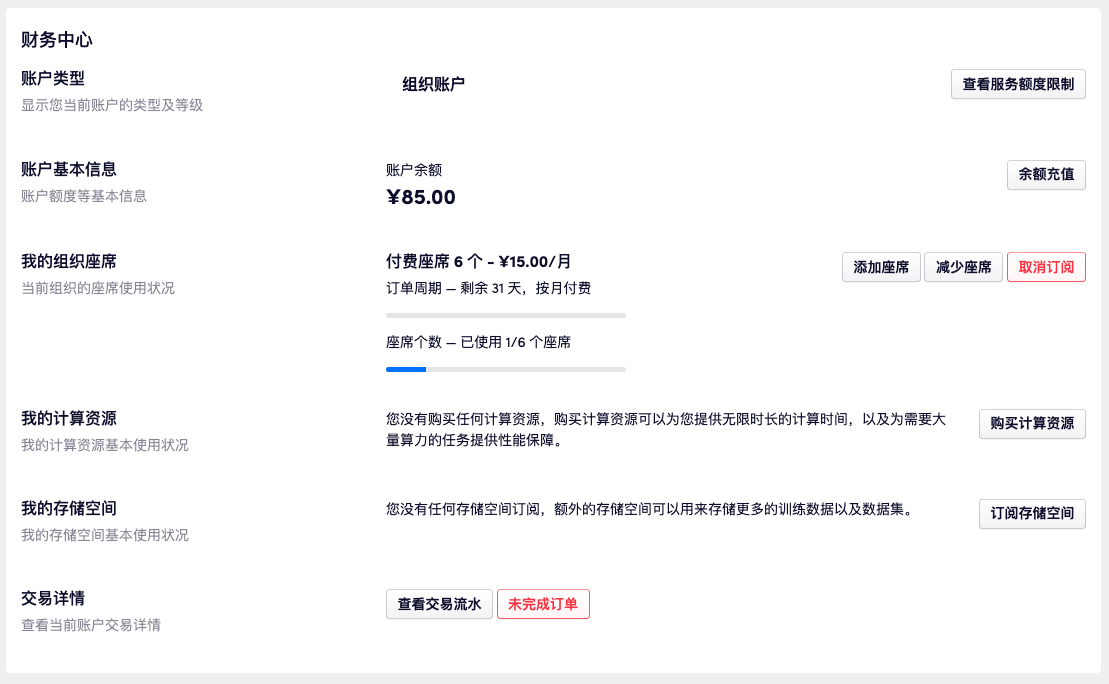 每个组织是独立的命名空间,这意味着「数据仓库」「算力容器」在组织下有独立的访问权限。同时,组织下的「存储」「计算资源」也是独立的。也就是说在组织下构建的任何资源都会使用组织的资源(存储、算力)而不是个人的资源。