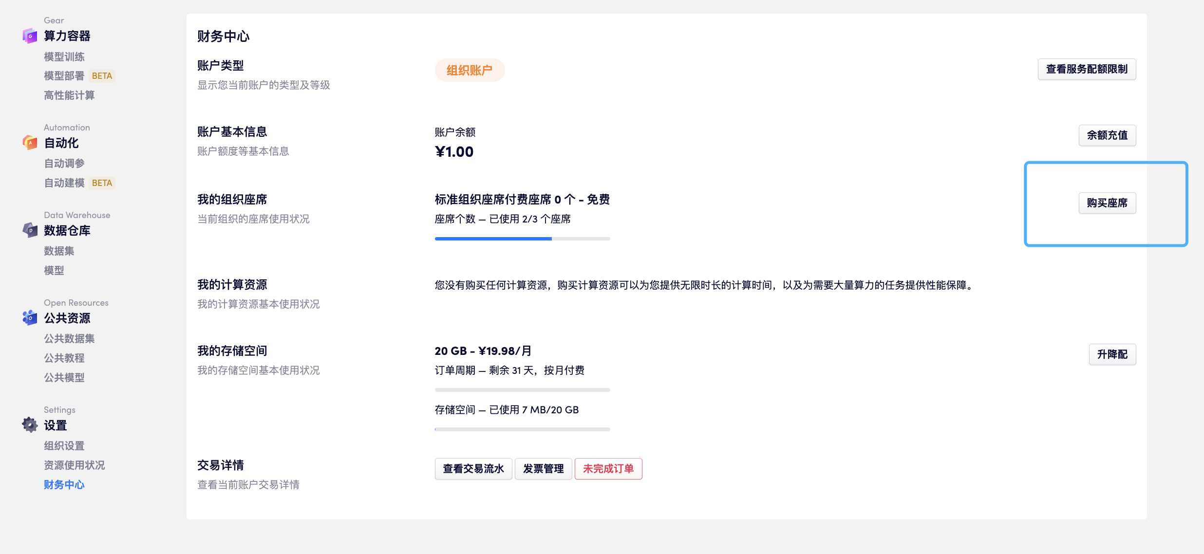 座席与存储资源类似,按月收费。