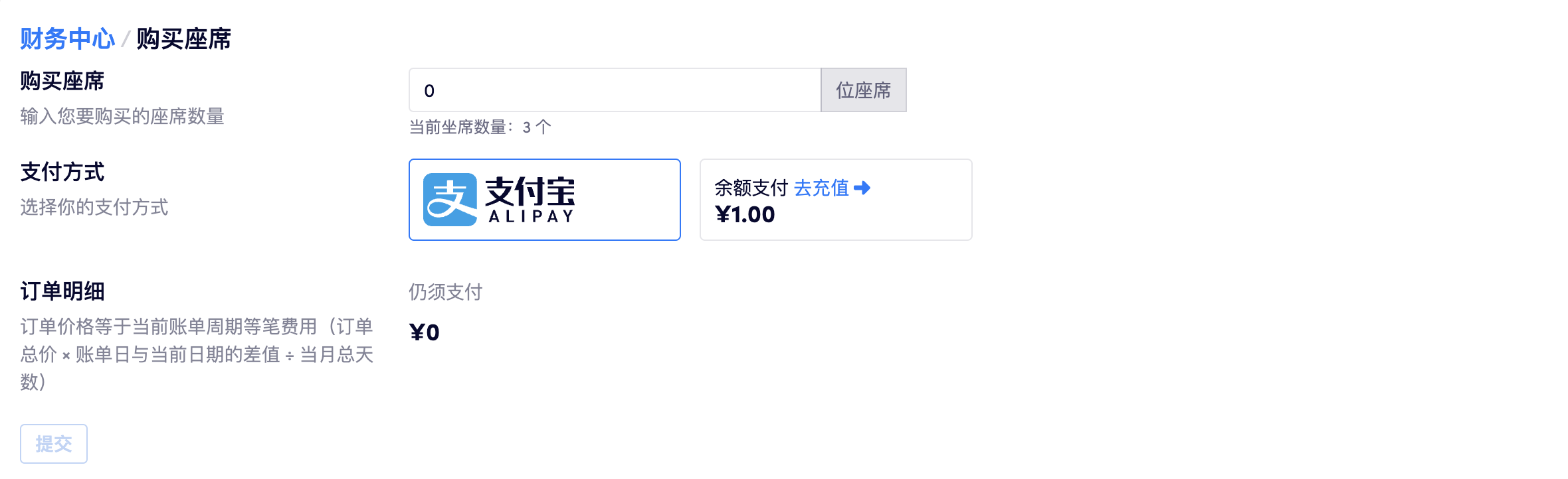 为了统一存储空间及座席订单的周期,当用户订阅存储空间且订单周期不满一个月时,座席订单金额会根据剩余天数显示为相应的折扣价格(订单总价 ✖️ 账单日与当前日期的差值 ➗ 当月总天数)。次月坐席订单将按照 ¥5/人/月 进行扣费。