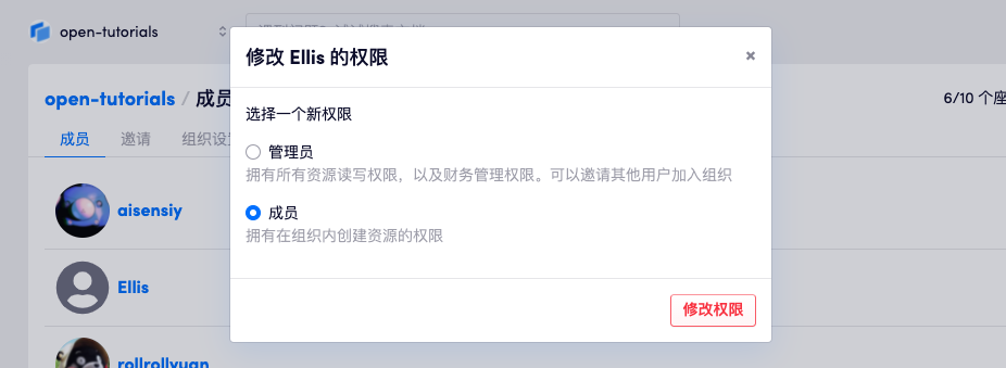 只有组织的管理员才能修改组织成员的权限。