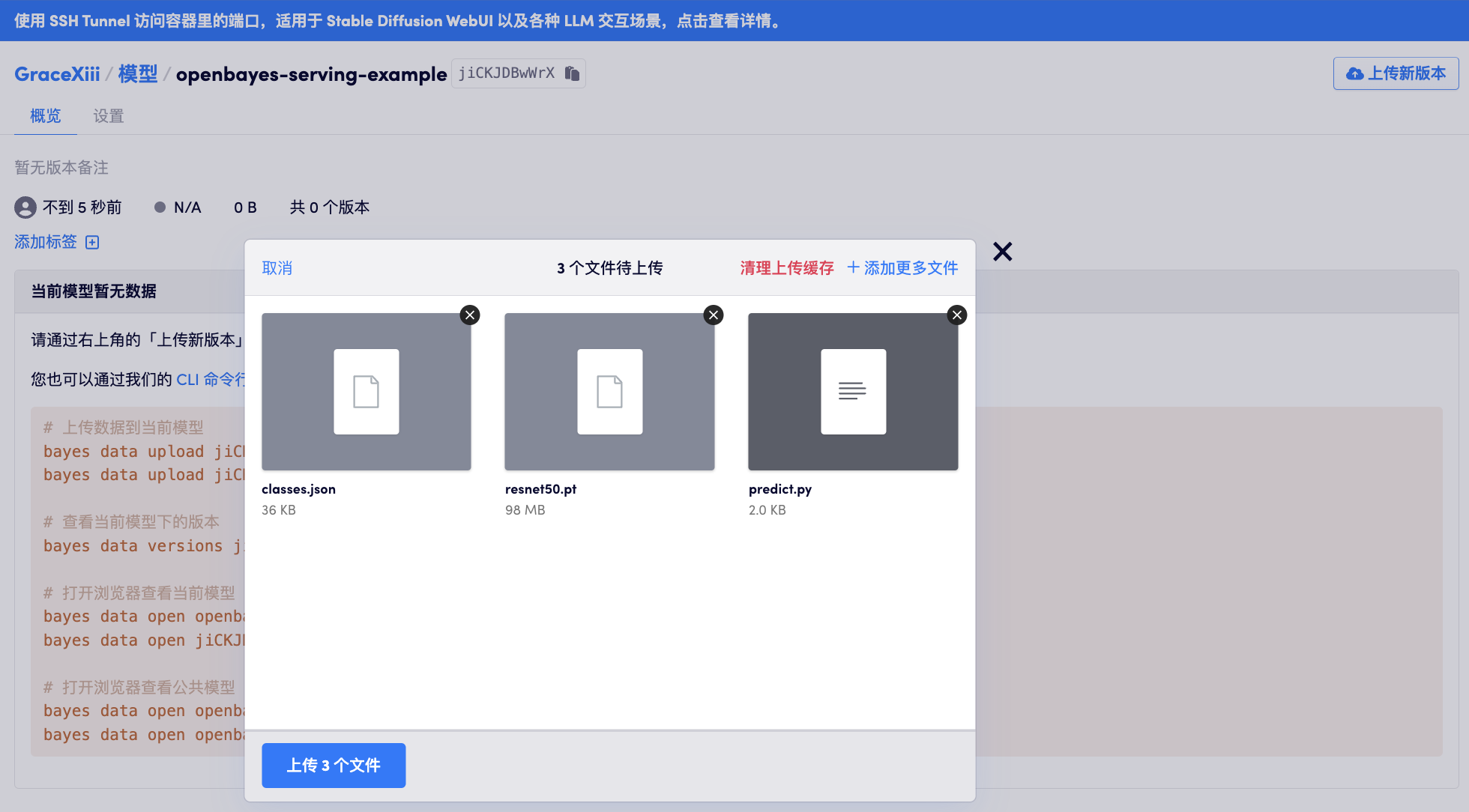 resnet50.pt为模型文件。predictor.py目前 OpenBayes 模型部署要求其文件名称固定为predictor.py使用其他的文件名将会导致部署失败。classes.json包含 resnet 分类的元数据,在展示分类的名称时使用。