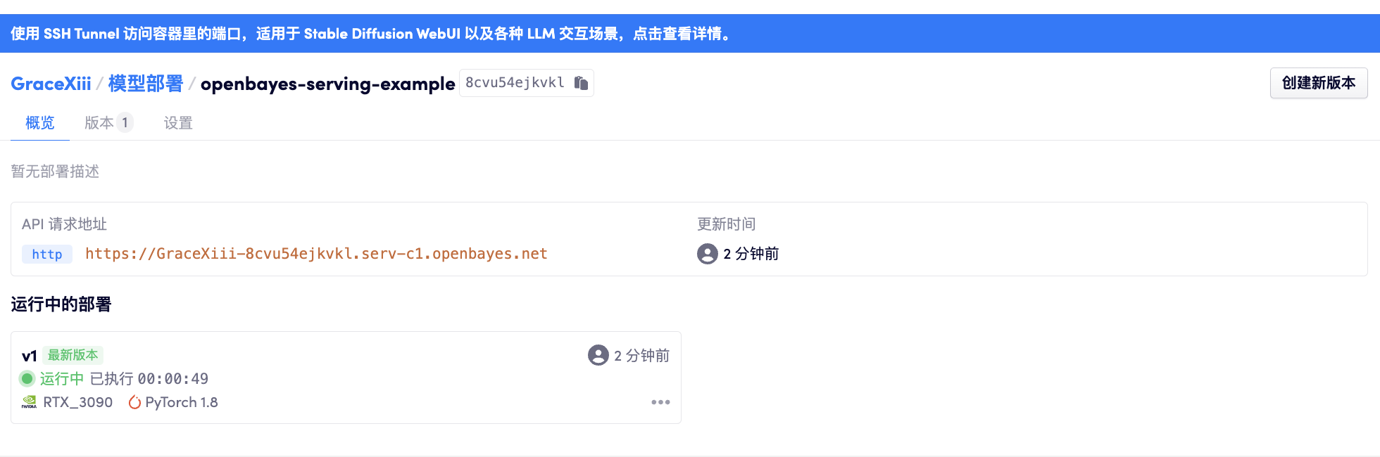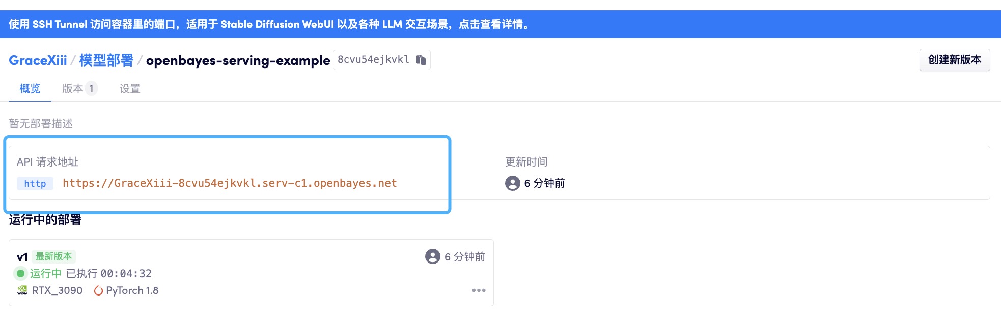 在模型展示为「运行中」后可以看到「概览」页面展示了当前部署的 http 访问地址。