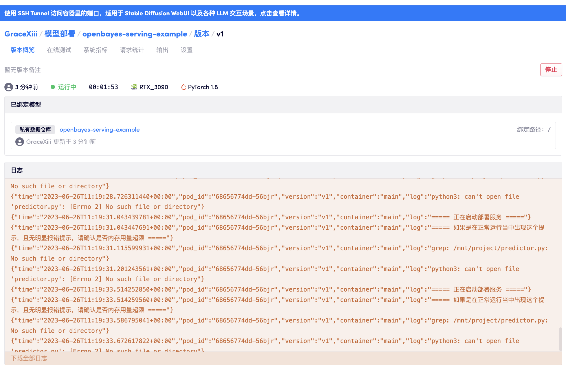 点击当前最新的部署版本(也是目前唯一的部署版本)查看日志: