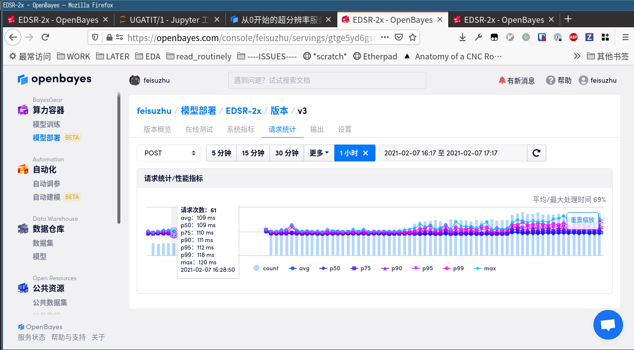 我们将最后的 requests.post 包裹在 while True: 中,不停地请求服务,然后在「请求统计」中观察: