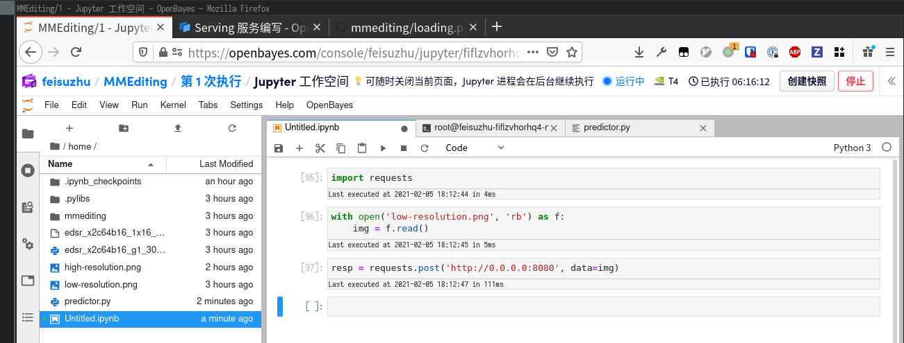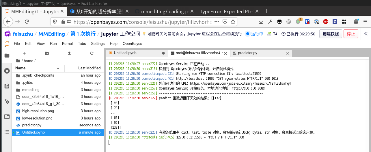 可以看到基本就是我们之前在 Notebook 中写的代码,填到了固定的框架中。将文件保存为 predictor.py,开启新的 Terminal 运行它。