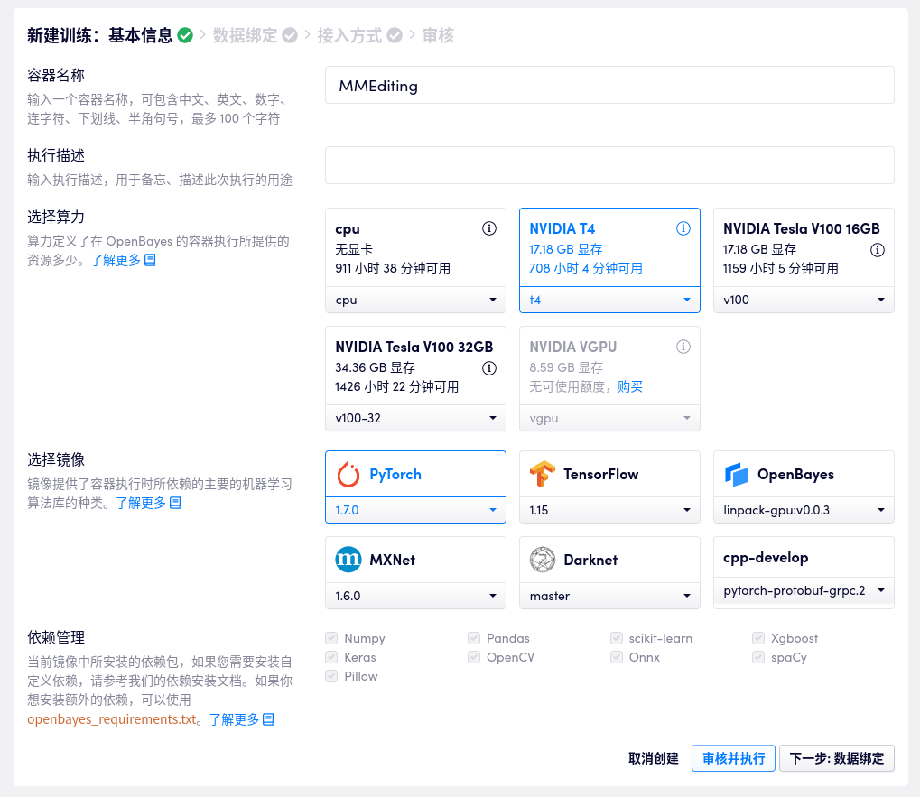 首先,新建一个「模型训练」算力容器,选择 PyTorch 镜像,取名叫做 MMEditing。
