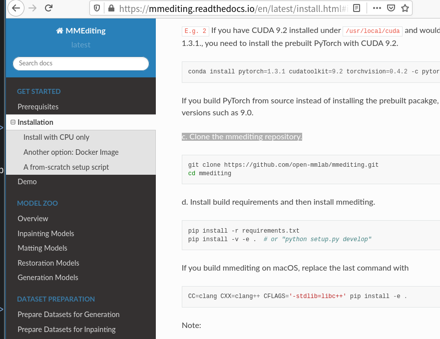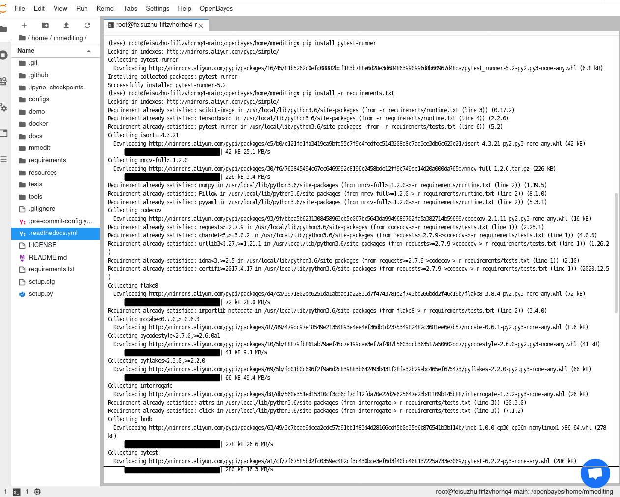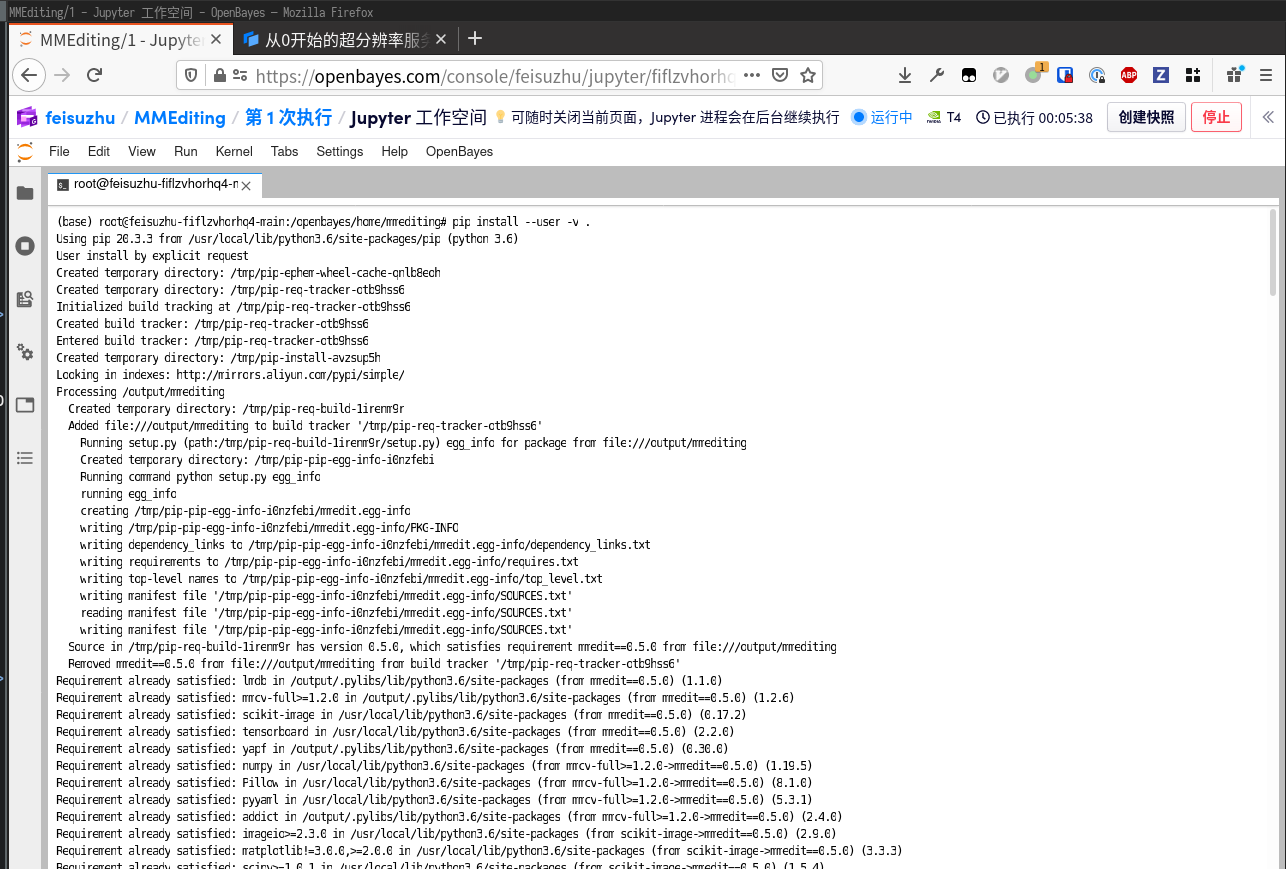 最后执行 pip install --user -v . 安装好 mmediting 库本身。这里不要加 -e 参数(开发模式)而是正常安装,因为模型上线后也需要它。
