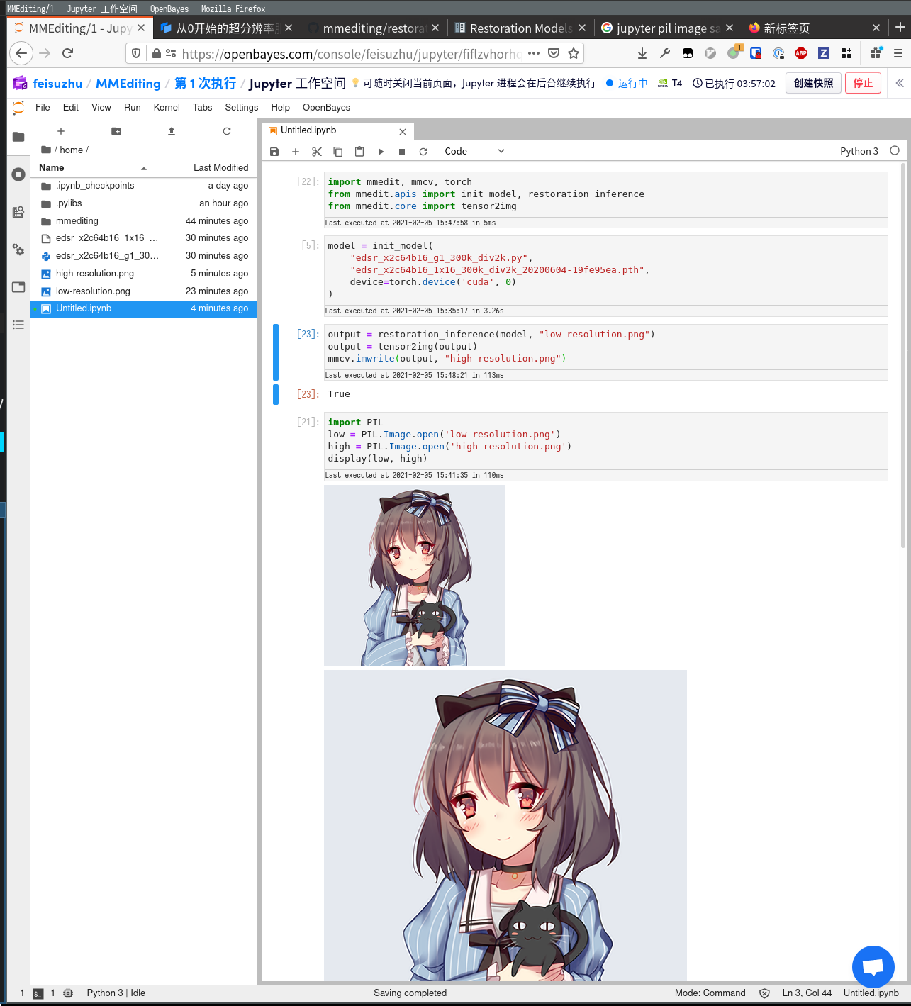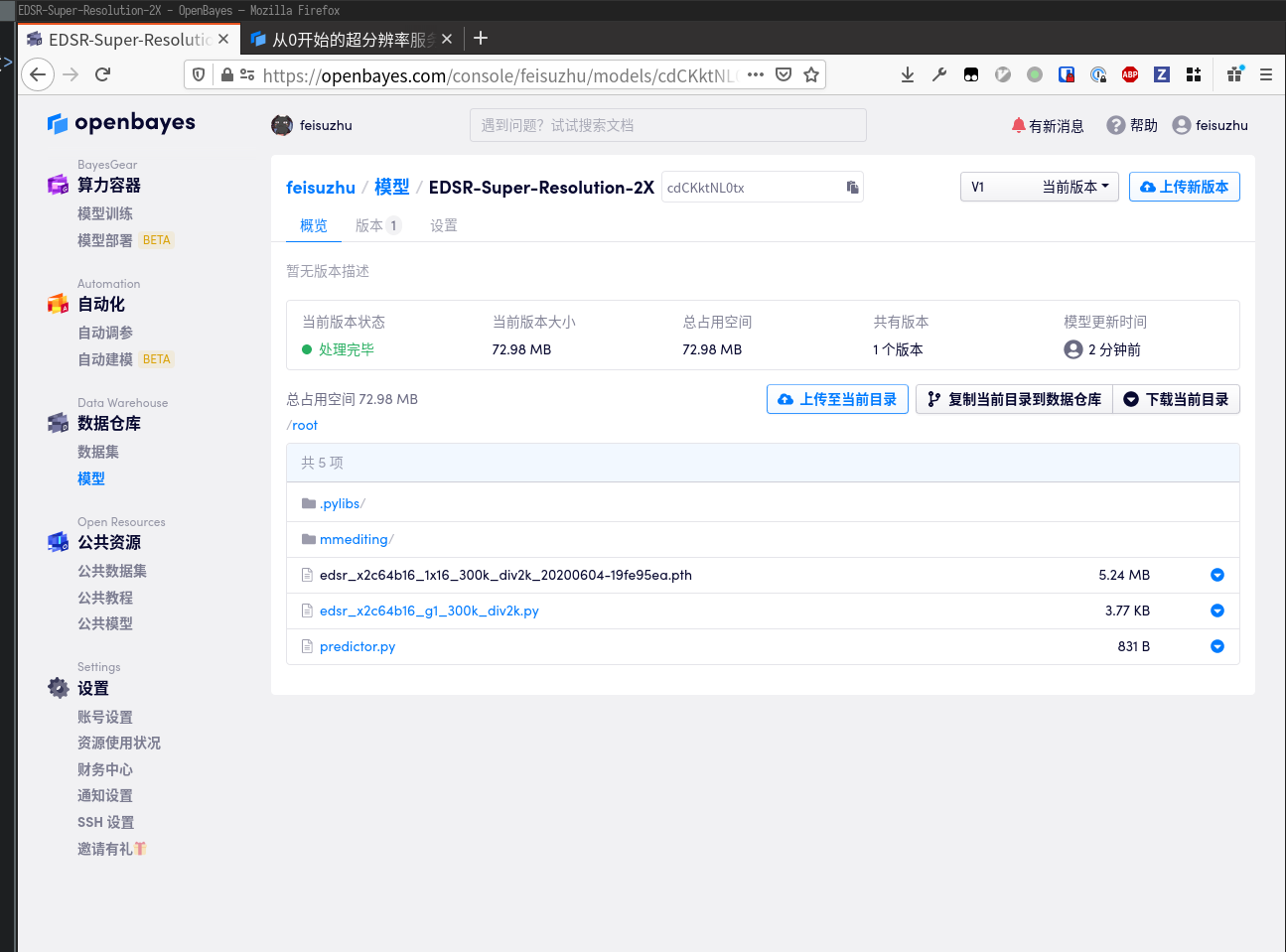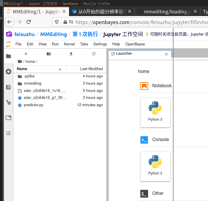 然后我们在文档的 Model Zoo/Restration Models 找到了预训练的 EDSR 模型,把配置和模型文件下载下来并上传到算力容器的 home 目录下(可以用 Jupyter 工作空间的上传按钮,也可以直接拖动到文件列表上)。