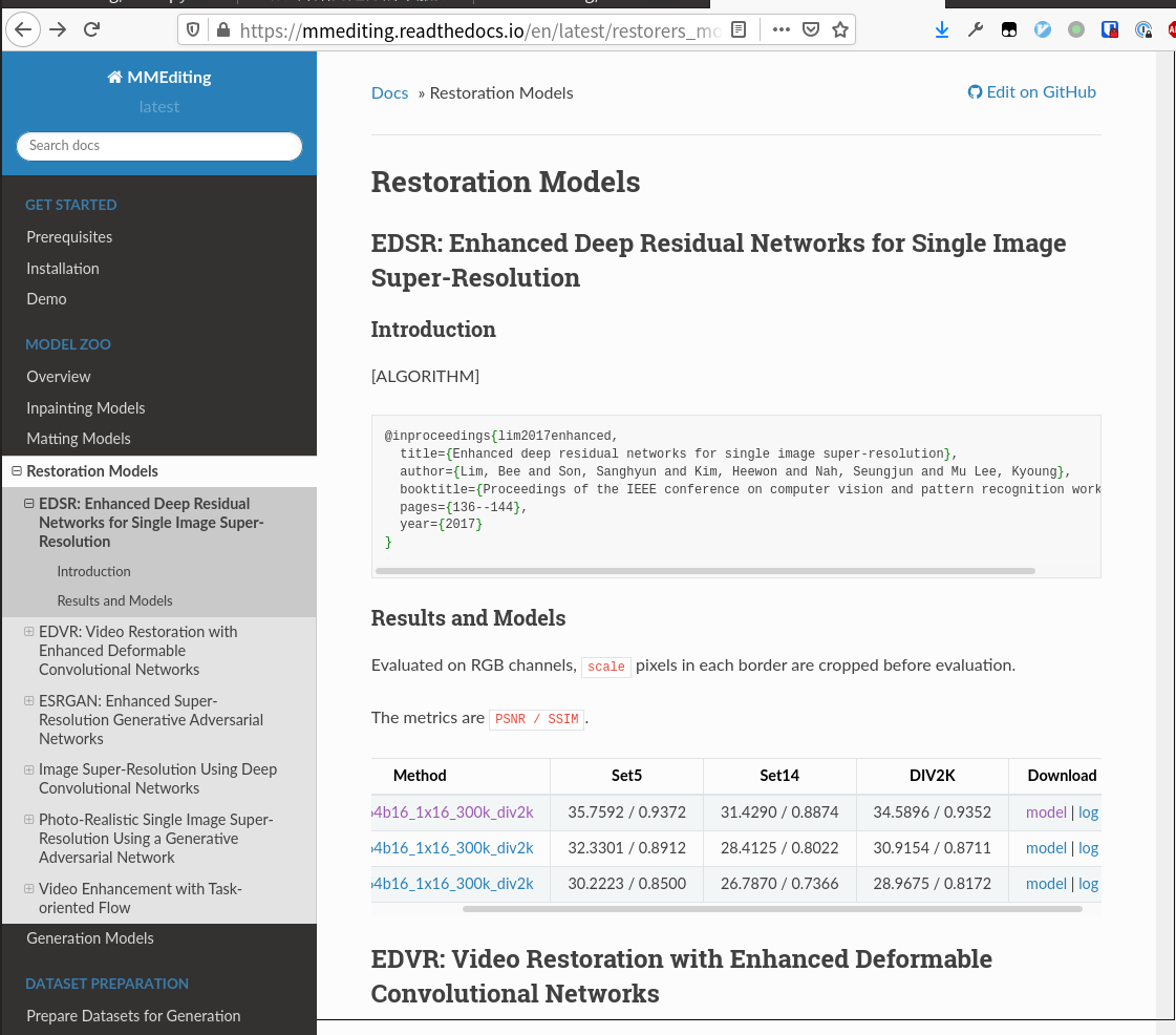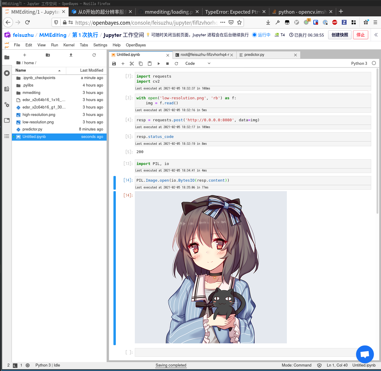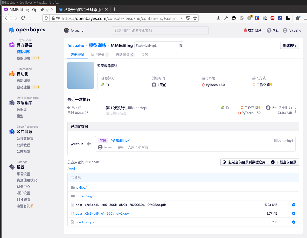 然后我们在文档的 Model Zoo/Restration Models 找到了预训练的 EDSR 模型,把配置和模型文件下载下来并上传到算力容器的 home 目录下(可以用 Jupyter 工作空间的上传按钮,也可以直接拖动到文件列表上)。