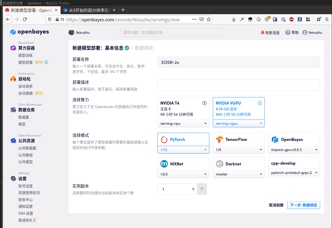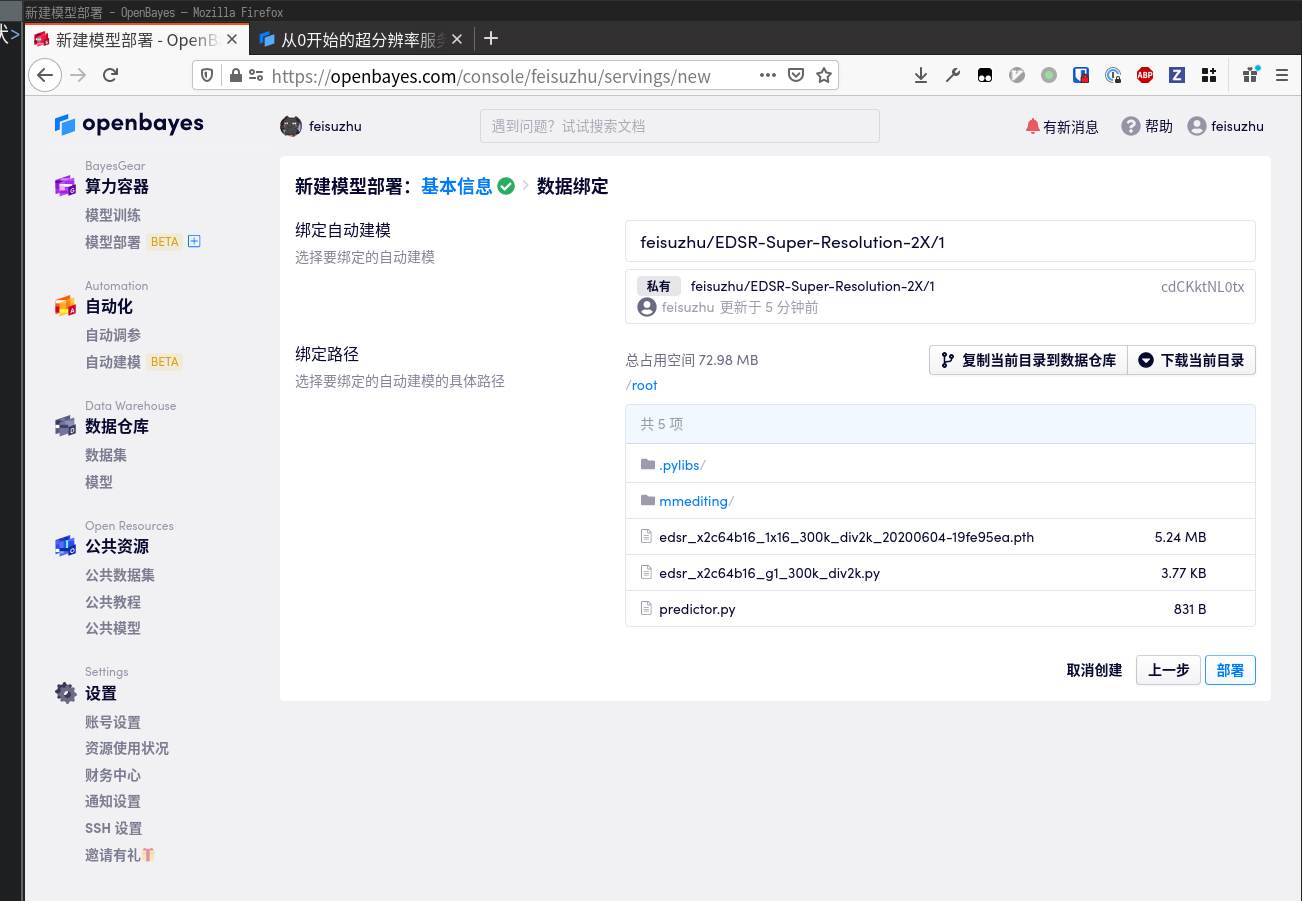 绑定刚刚准备好的模型,点击「部署」