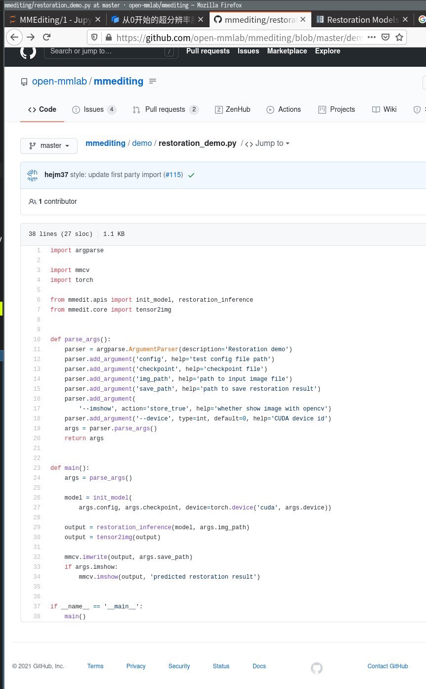 在 mmediting 的仓库内的 demo/restoration_demo.py 可以找到超分辨率的样例代码