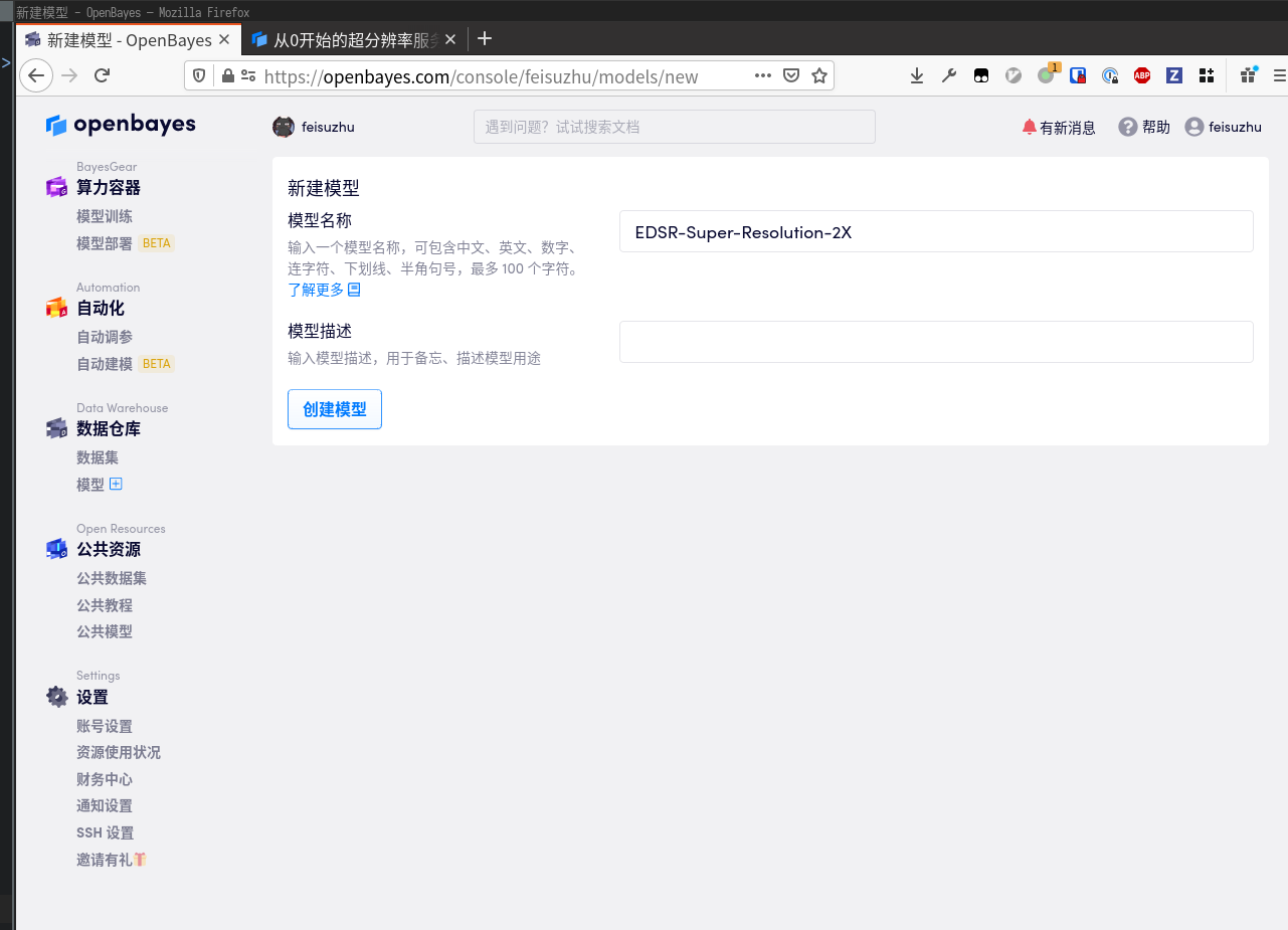 停止算力容器,等待完成同步后,在左侧边栏「数据仓库」处找到「模型」,点击「创建新模型」。