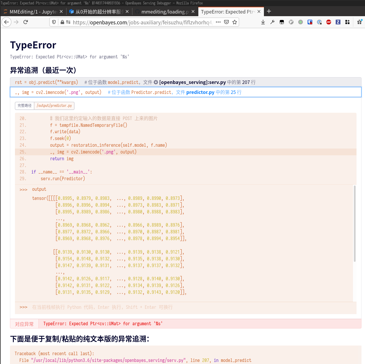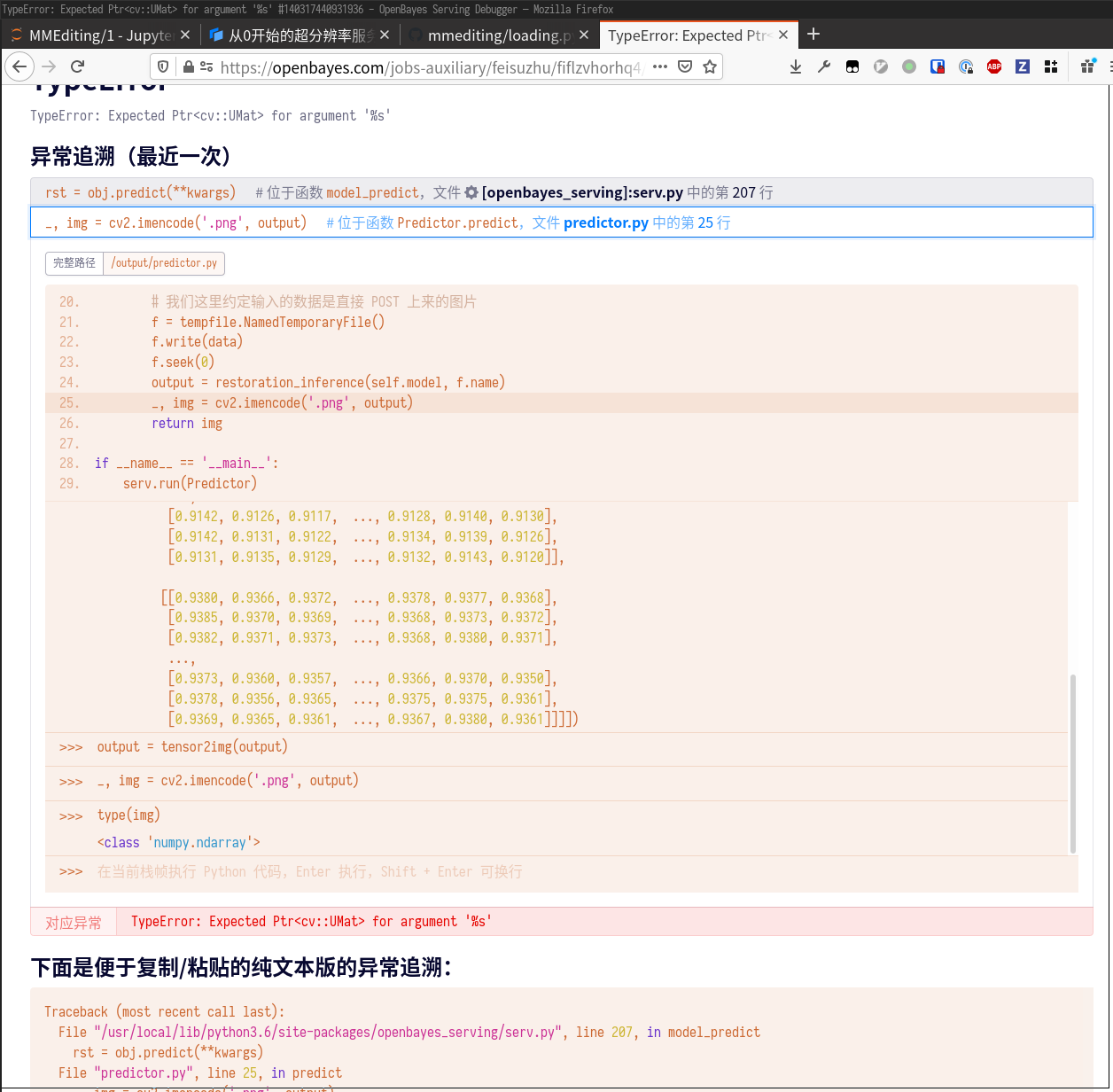 cv2.imencode 会失败,很可能是因为 output 参数不太正常。我们按照提示打开调试链接,观察一下 output 变量的状态。