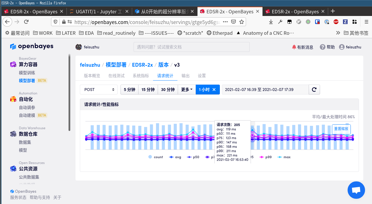 然后多开几个 Notebook,并行地向服务发送请求,再次观察。