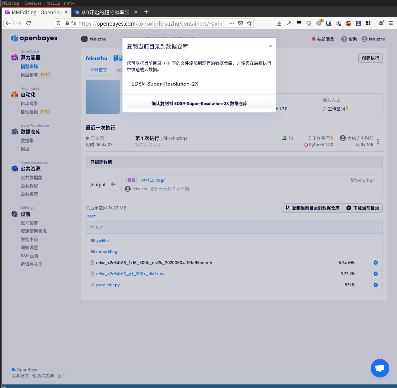 然后回到被关闭的算力容器处,点击「复制当前目录到数据仓库」。