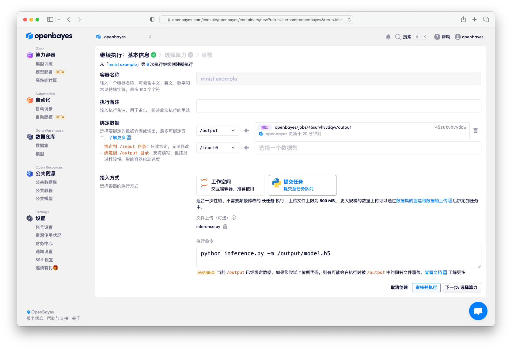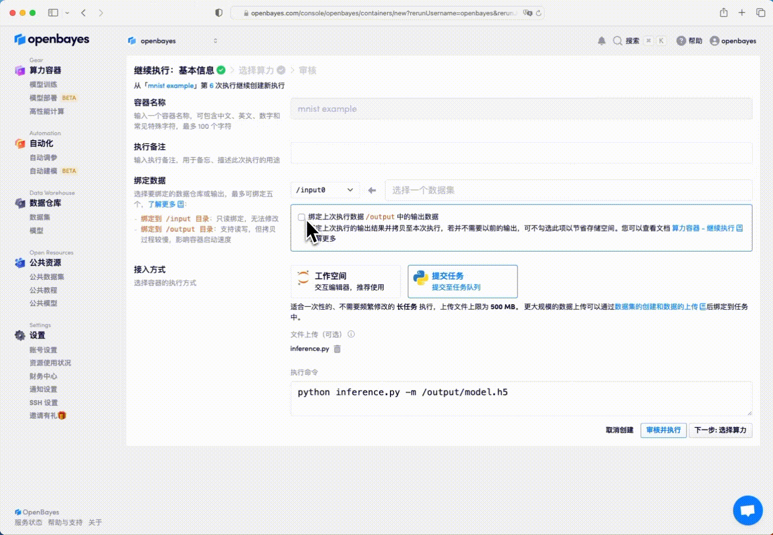这里将上一次的「工作目录」的绑定指向 /openbayes/home。更多有关「继续执行」的细节见算力容器的继续执行。