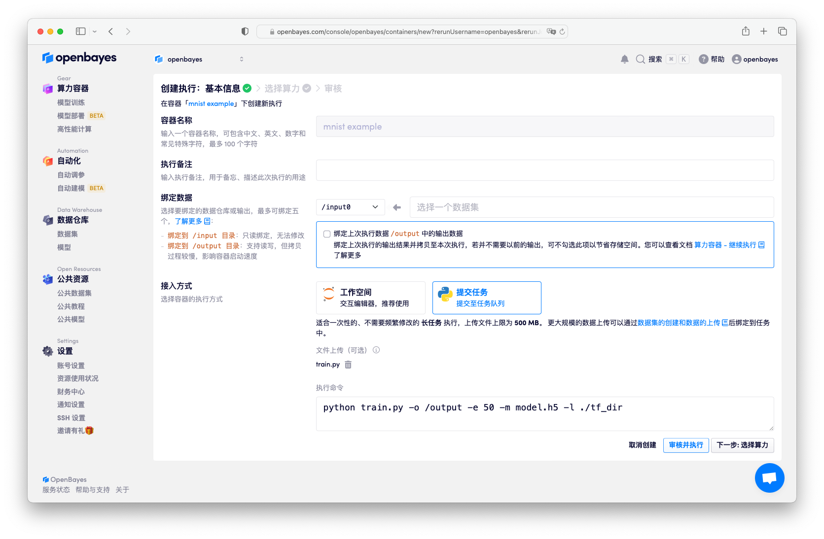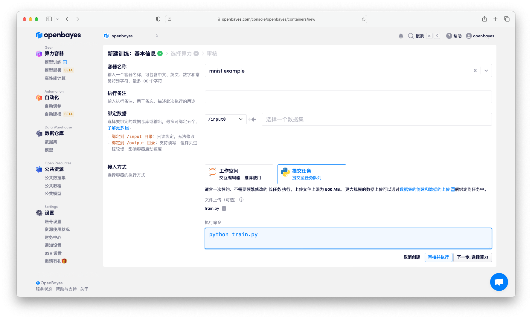 在 "新建容器" 页面下接入方式选择 Python 脚本执行,并将目录中 train.py 上传。在执行命令处输入命令: