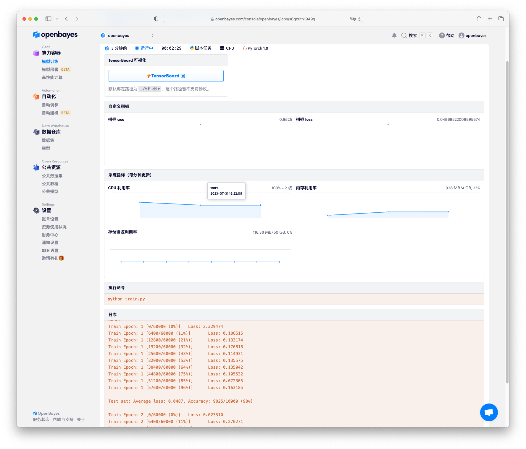 其中 -m /openbayes/home/model.h5 指定需要载入的模型的目录。提交并执行完毕后,可以看到日志中展示了对 10000 测试结果获取了 98% 的准确率。