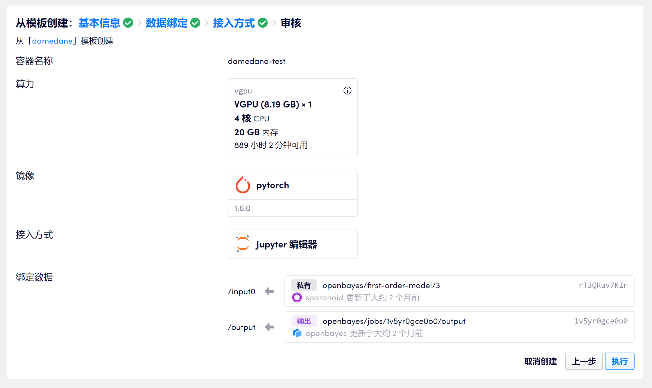 然后容器名称随便取,算力选择 vGPU 或者 CPU 都可以,vGPU 速度会快一些,但额度优先 CPU 有更多的赠送额度,但速度相对较慢。下面的参数都不需要改,镜像就用默认的 PyTorch 就可以了,然后直接点审核并执行: