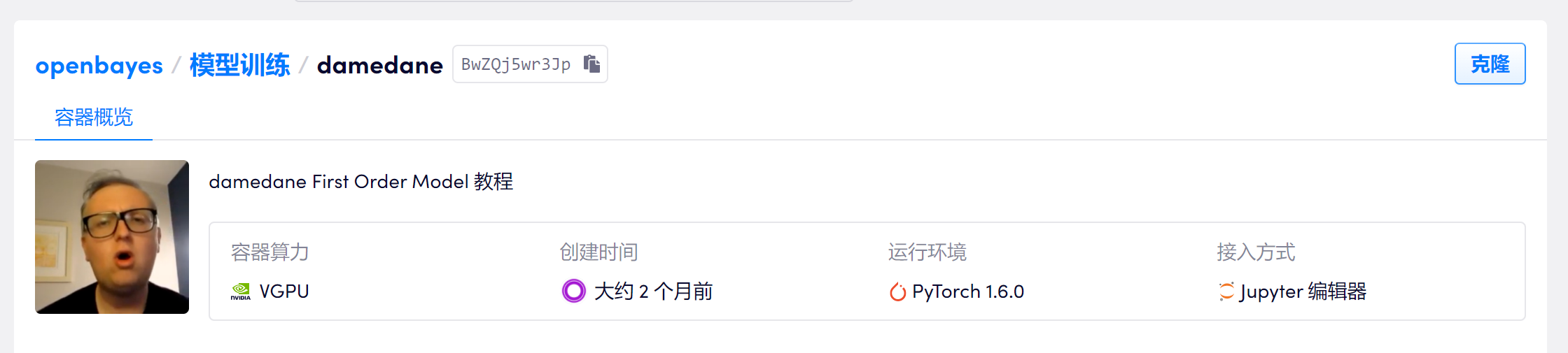 进入教程页面之后,页面右上角有一个克隆按钮,点击克隆后,将该教程克隆到自己的账户下: